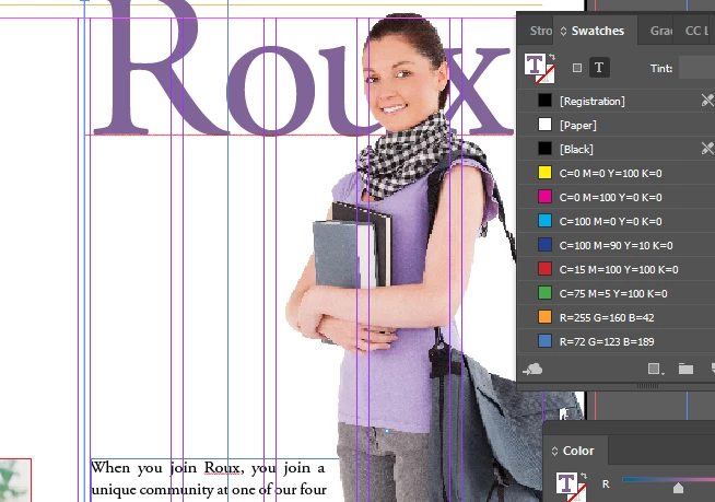 Post Eye Dropper Application trying to color coordinate the purple color on the woman's shirt using the Color Window and Swatches Box