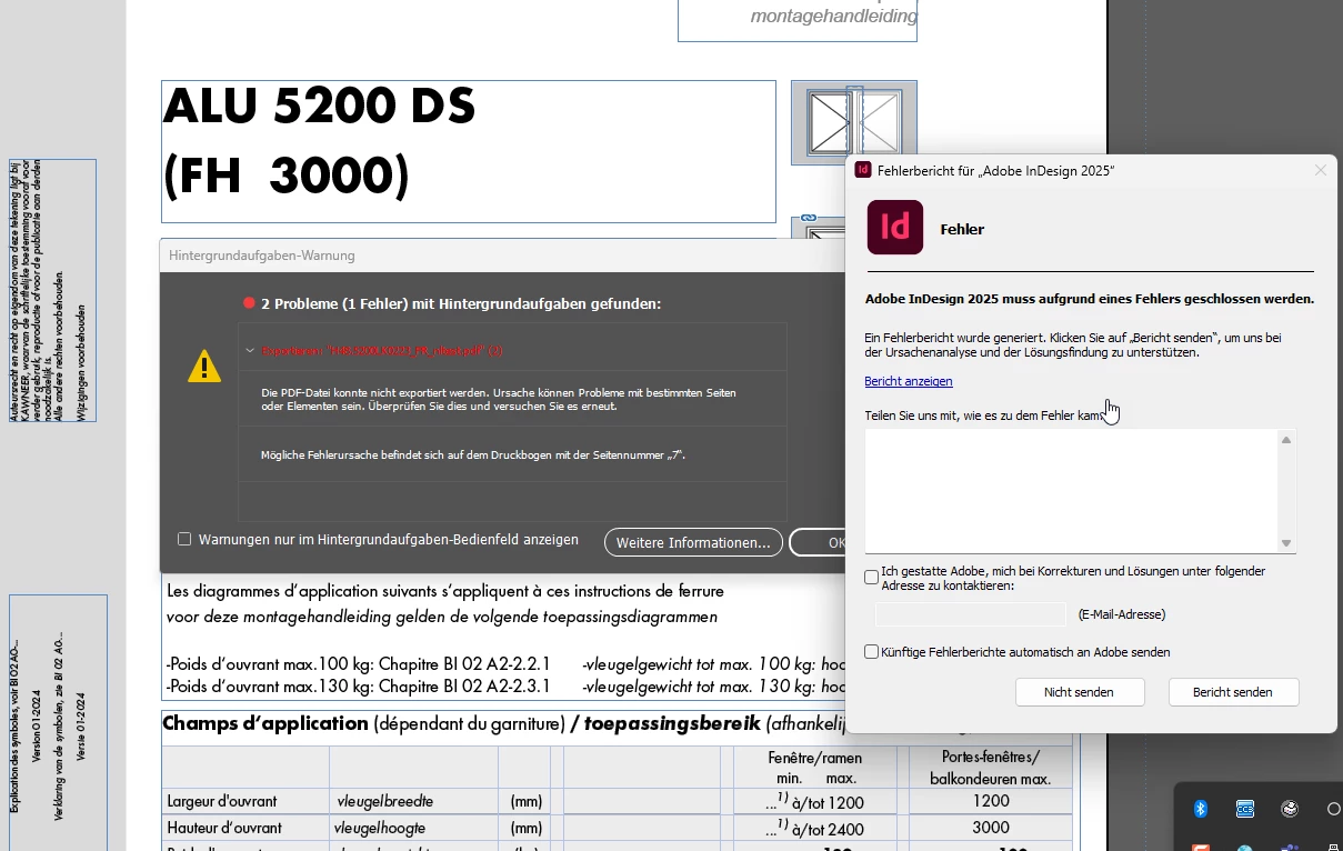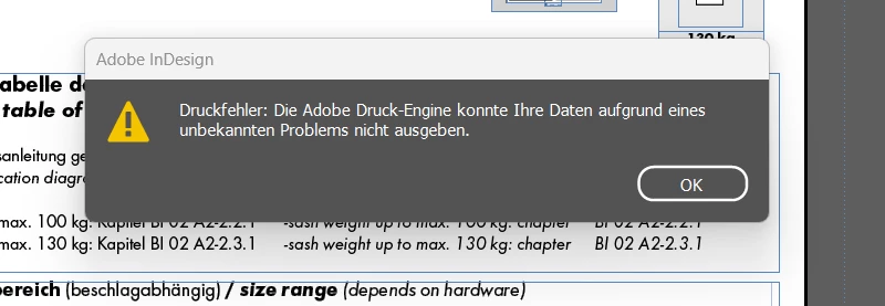 A couple days later I got the error message (in German): "PDF export failed. Poss. error cause can be found on print sheet 2 (or 4, or 7)." Contacted IT again and tried to uninstall ID (version 20), re-install same version (same problems). Again uninstalled ID 20, installed older ID version (19.5). No change. Between installing versions shut down PC and re-start. Uninstalled Acrobat Pro, re-installed from Creative Cloud - no change. When eporting from ID to PDF, the error message appears, ID is shut down and the original PDF (which was only to be updated) is lost! Then saved ID-file under a new name, export to PDF again with the new name - same problem. Always the remark on the "print sheet".