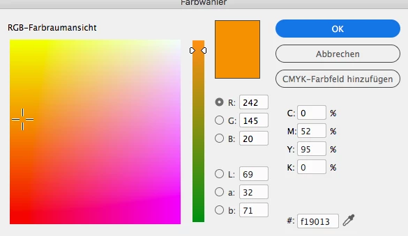 Wähle ich mein orangenes Feld aus (eigentlich #fa9202) zeigt es mir folgendes an. Was mich irritiert, hier kann ich ein CMYK-Farbfeld auswählen...