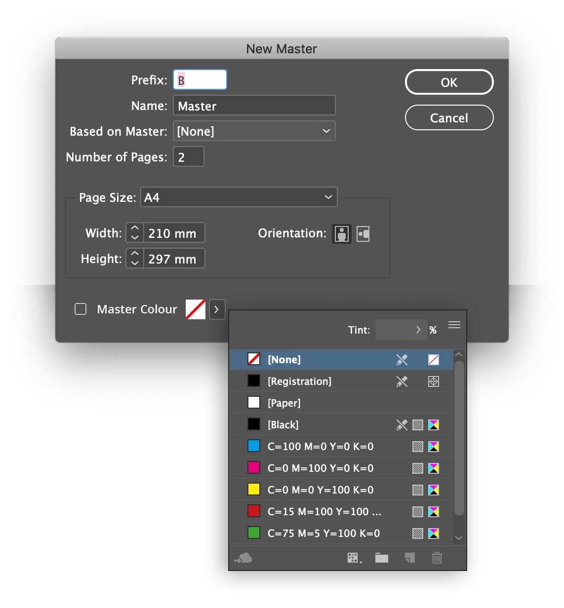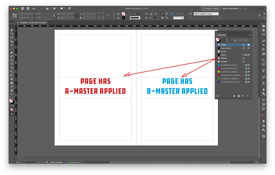 Now when type has character colour or an object has fill or stroke colour set to [Master] the text or object would dynamically change when it is placed on a page with a different master applied to it. So for instance on pages with A-Master applied the object or text would adopt the colour set in Master page options and on pages with B-Master the text or objects would adopt the colour set in the options for B-Master. See Image04
