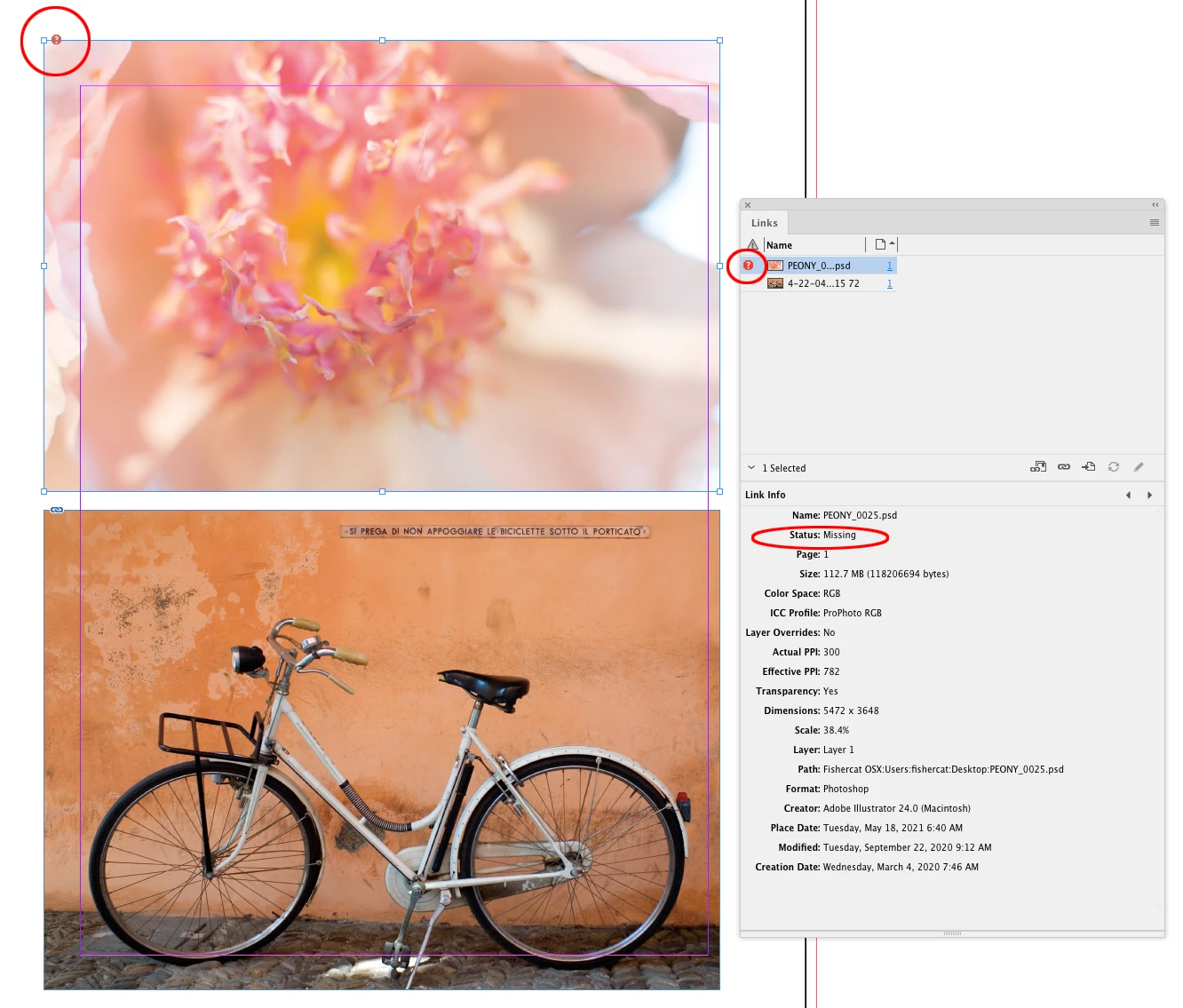 Here the top image was placed on the page, and then moved to a different folder, so its Status shows as Missing—InDesign can’t find the original. The bottom image has not been moved and its Status is OK.
