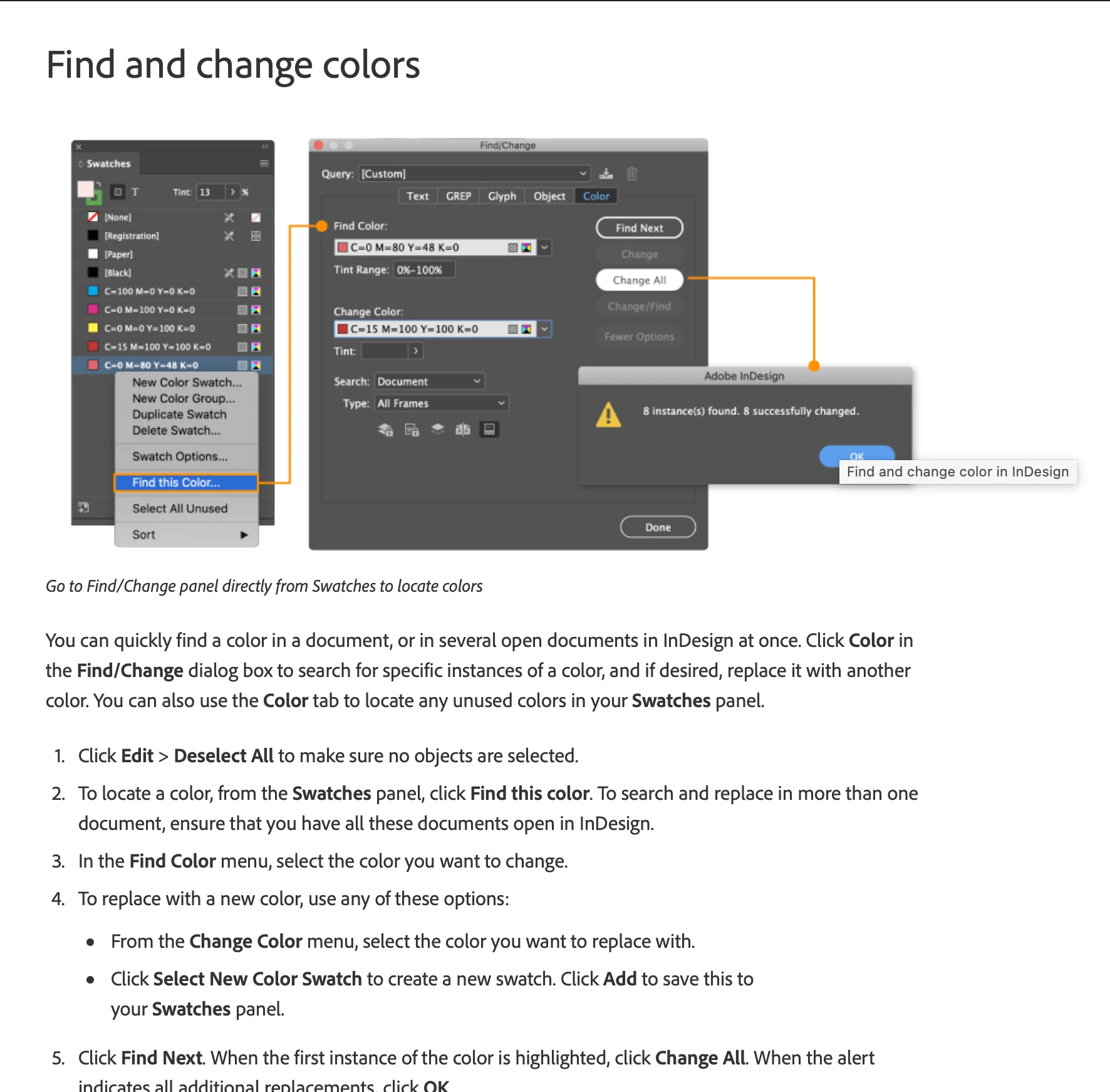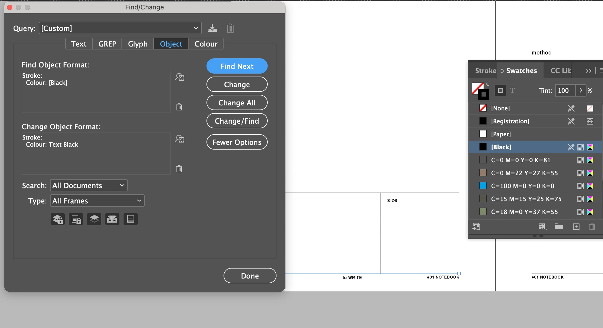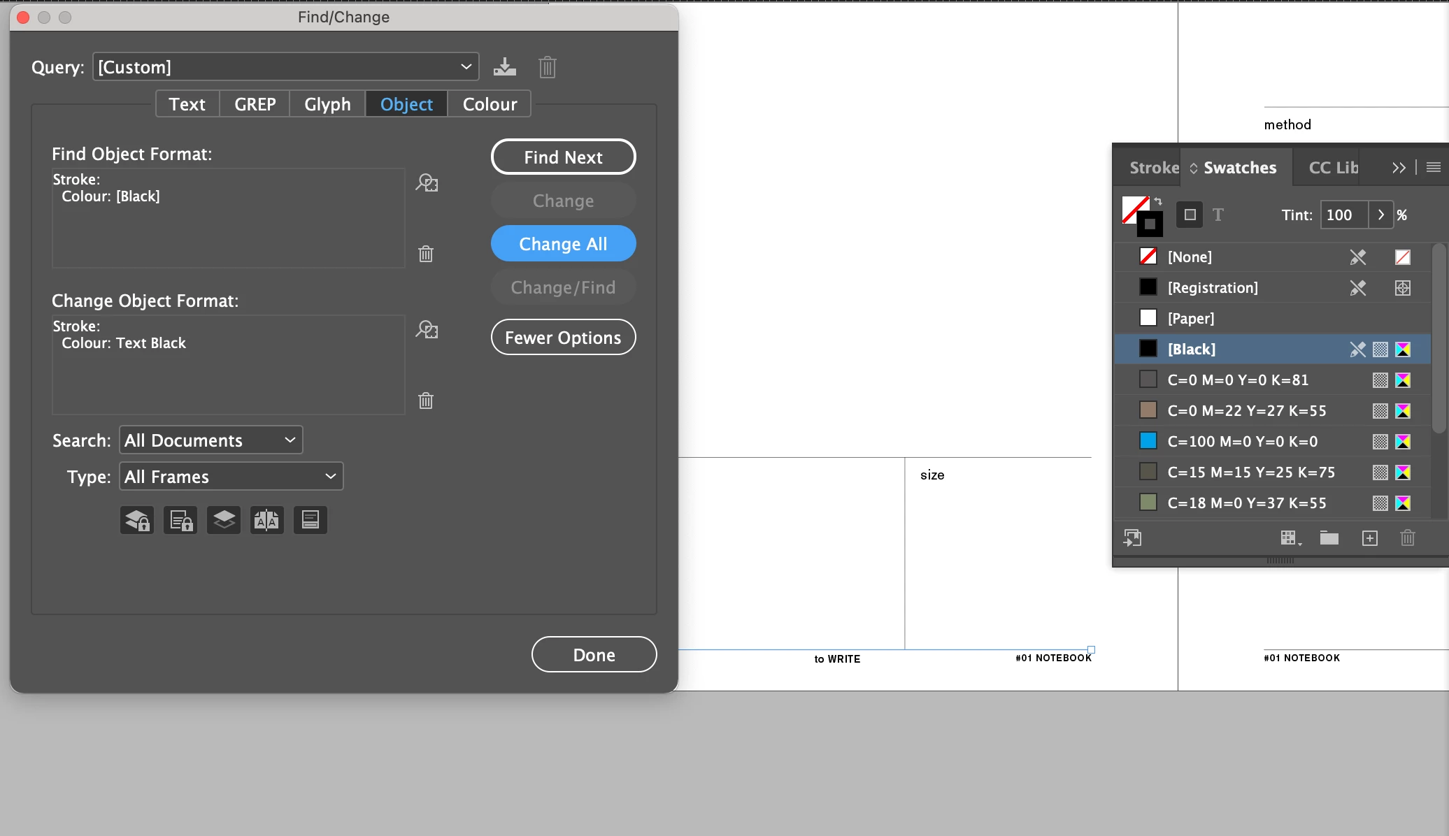 I'm trying to find all objects with a Black stroke in my document and change them to a spot colour (called Text Black in my document), but Find/Change isn't changing them – or rather it is 'changing' them to Black (if I Find objects with another coloured stroke – or fill – and ask InDesign to change it to Text Black using the Find/Change function, it changes the colour to Black). I can manually change the colour, but this is very time consuming as there are a lot of lines.