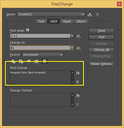 And here's the section of the Find/Change dialog box in Indesign that I'm trying to set as a GREP expression in that text file. You can see that I can set it to find only those characters with the [Basic Paragraph] applied to them.