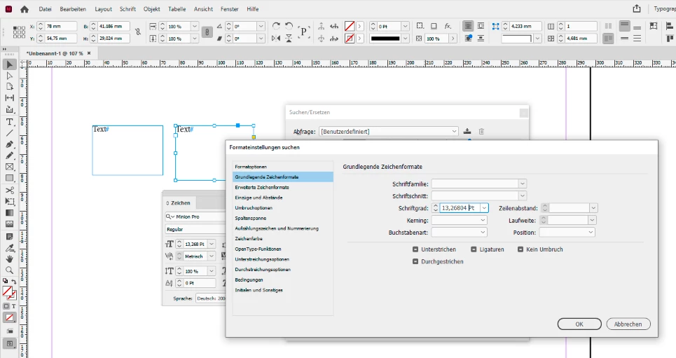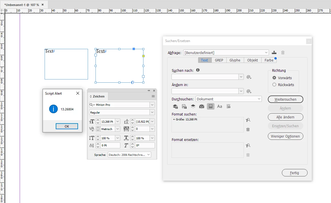 Leider kann InDesign keine Schriftgrößen mit zwei- oder dreistelligen Kommatas suchen und finden. Also nur Größen wie z.B. 17.5 oder 18 genau...
