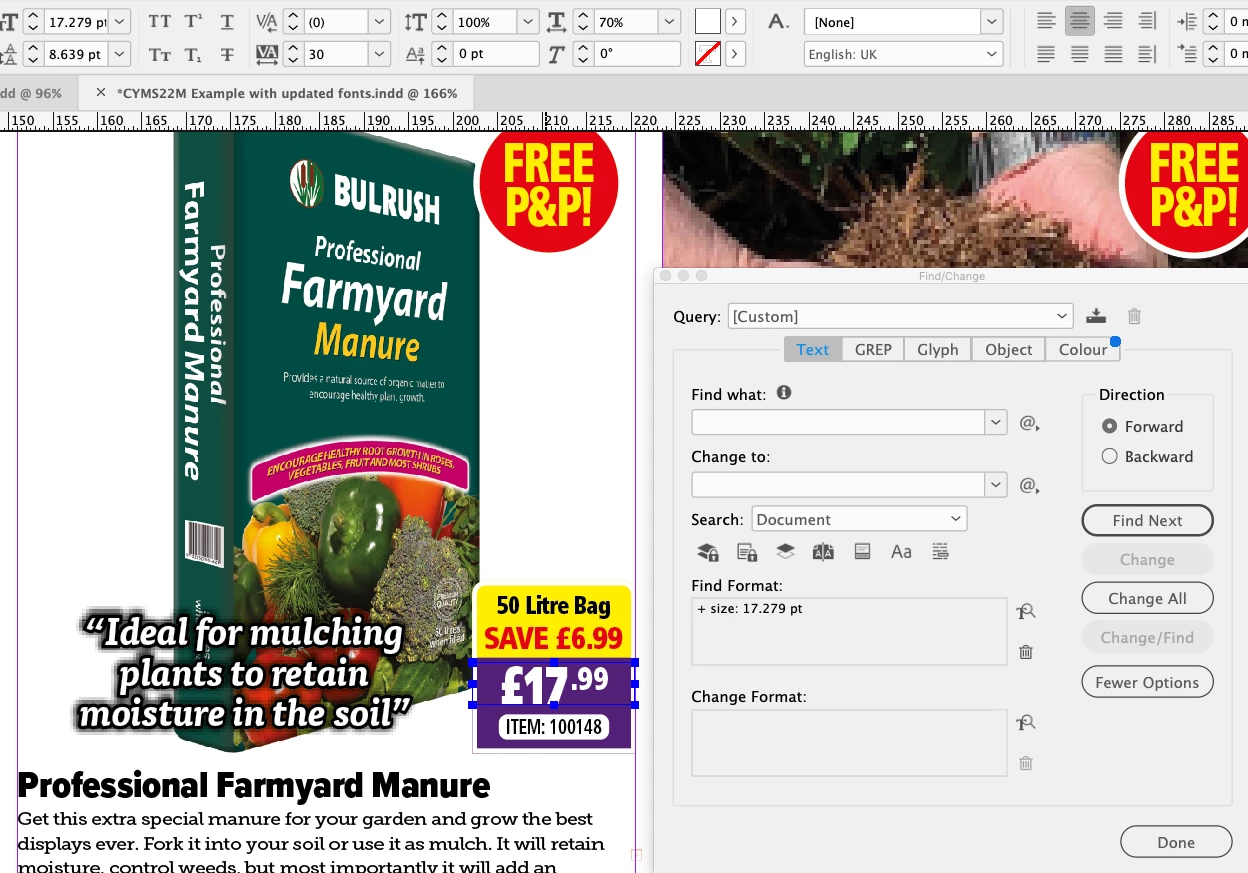 "point size 17.279, in the font Humanist 721 Extra Black. That found nothing (even though there were hundreds of examples), so I stripped it right down to a simple search for text in point size 17.279. Still it finds nothing."