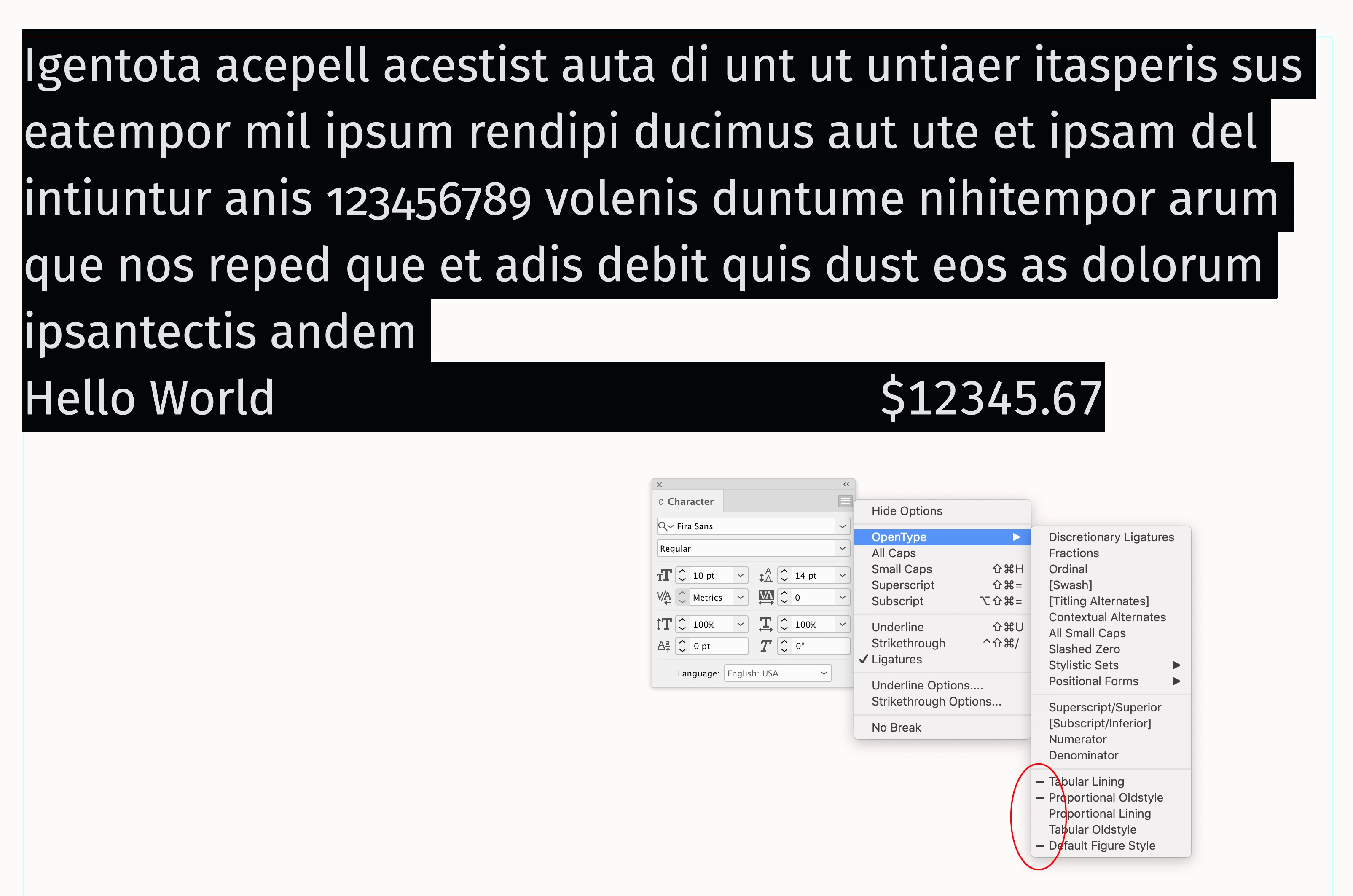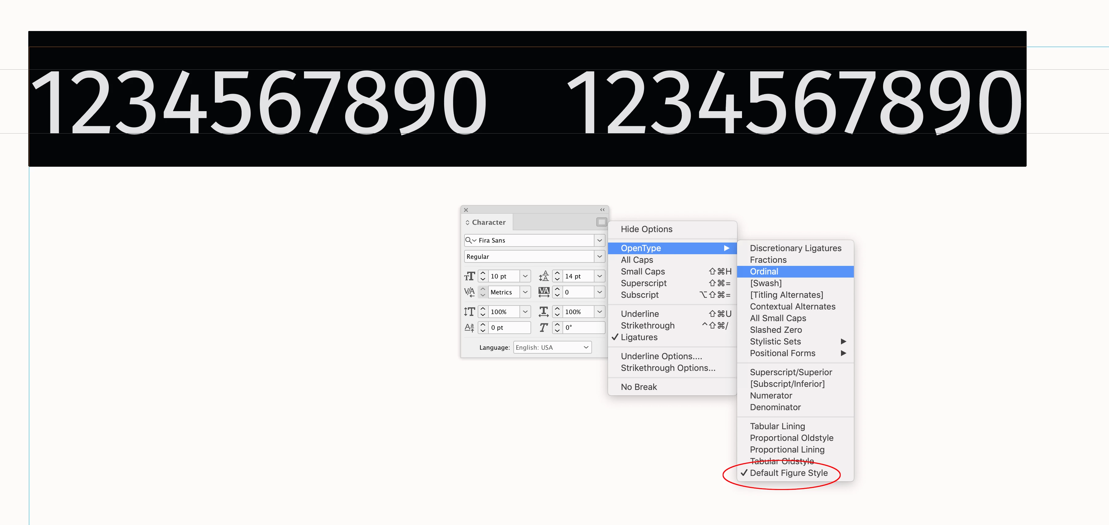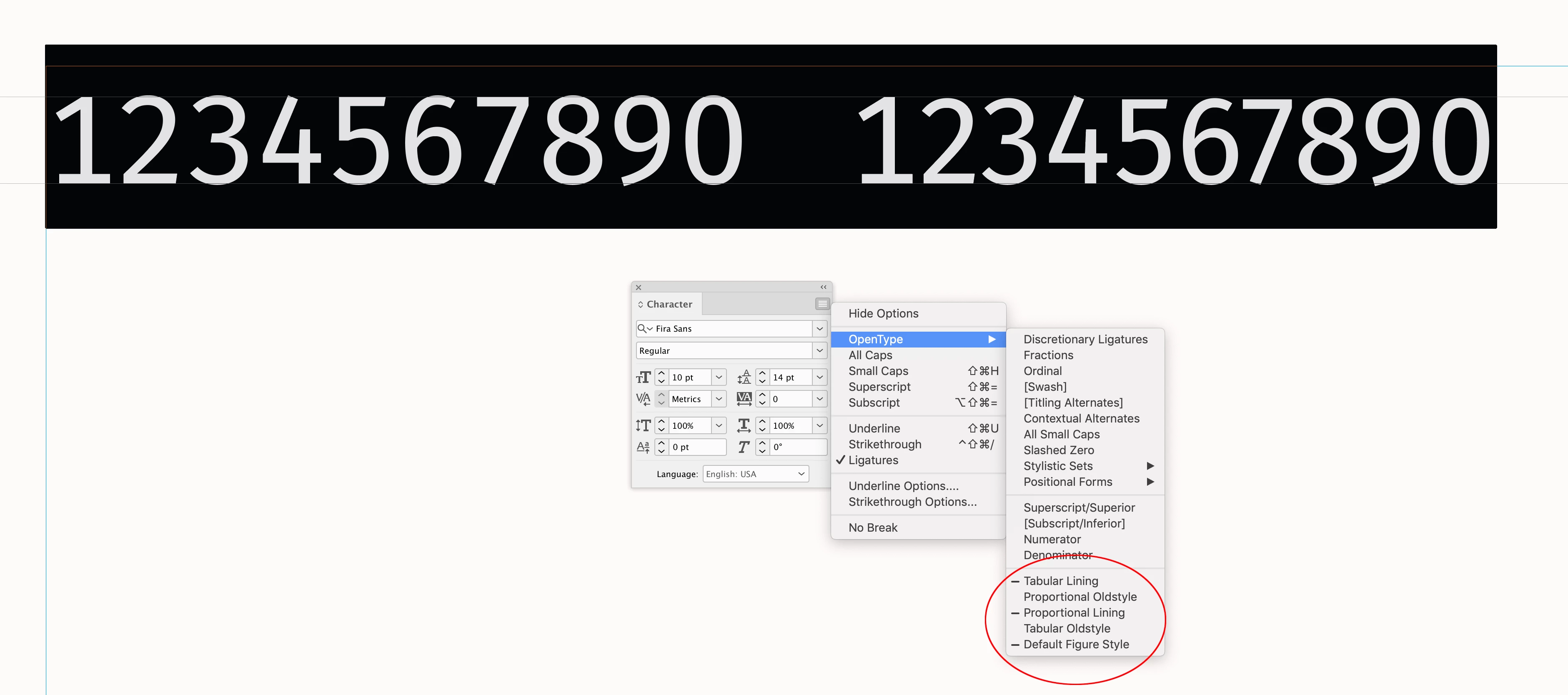 I have formatted at 700 page document for a company book. Their in-house style is Fira Sans. I downloaded this typeface from Adobe. The number 1 is larger than the other numbers throughout the document when looking at the document at 100%. I thought this was the style but looking it up online it says the numbers should all be the same height and in fact when I increase the size to 300% hey presto all the number are the same size. BUT when printing the pages the number 1 looks sightly smaller than the other numbers and the number 2 is slightly bigger! What is going on?! First screen shot from Indesign at 100% and second at 300% and third close up photo of printed numbers. The numbers are all at 100% in Indesign on their vertical and horizontal.