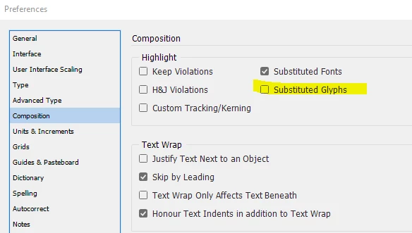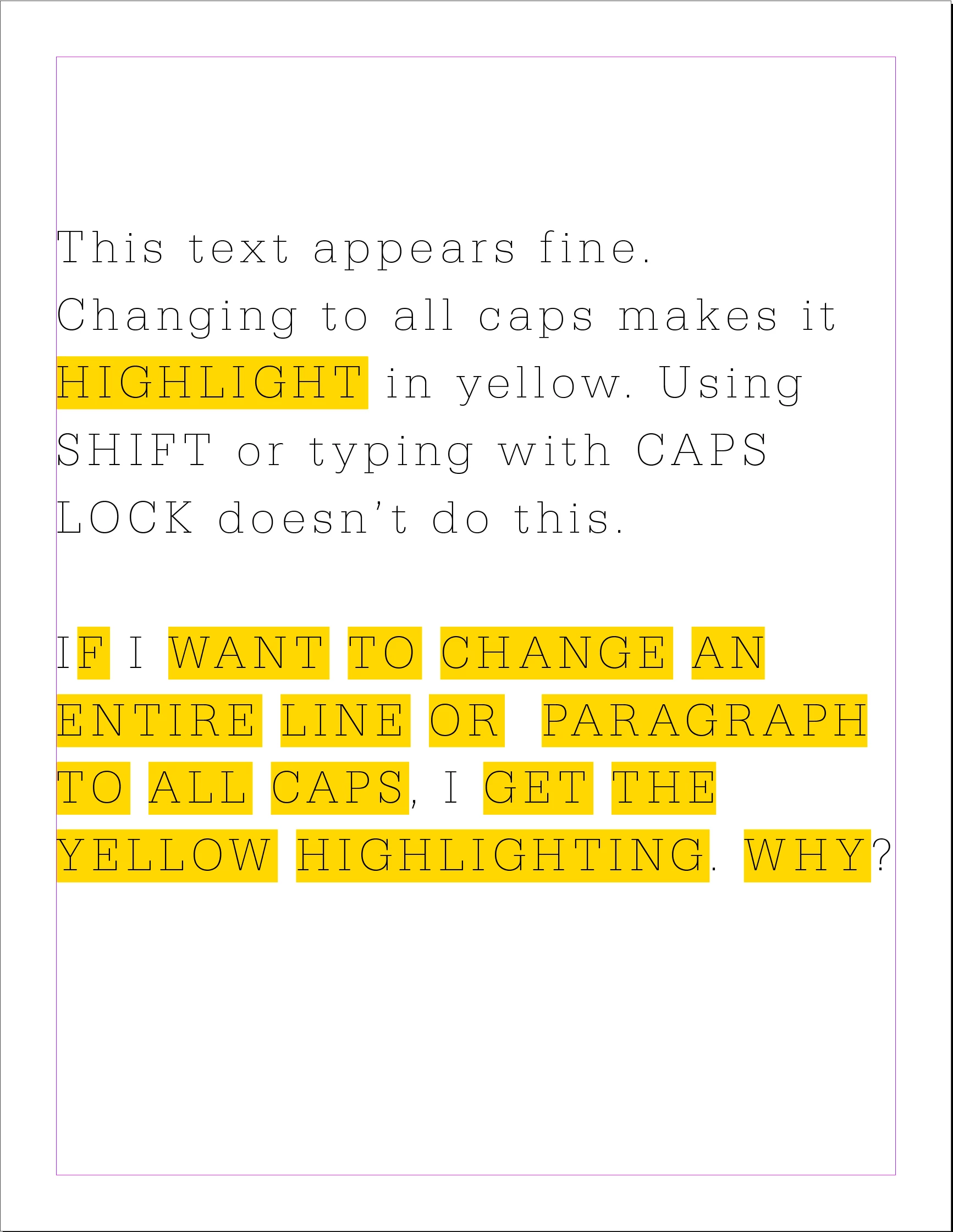 I've been using InDesign for years and have never had this issue until the past couple of weeks, after getting a new computer and installing Creative Cloud. When I set a word, line or paragraph of text to be "all caps," it highlights that text in yellow. I know pink highlighting means a font is missing, but I've never seen yellow before and don't understand why it's doing this.