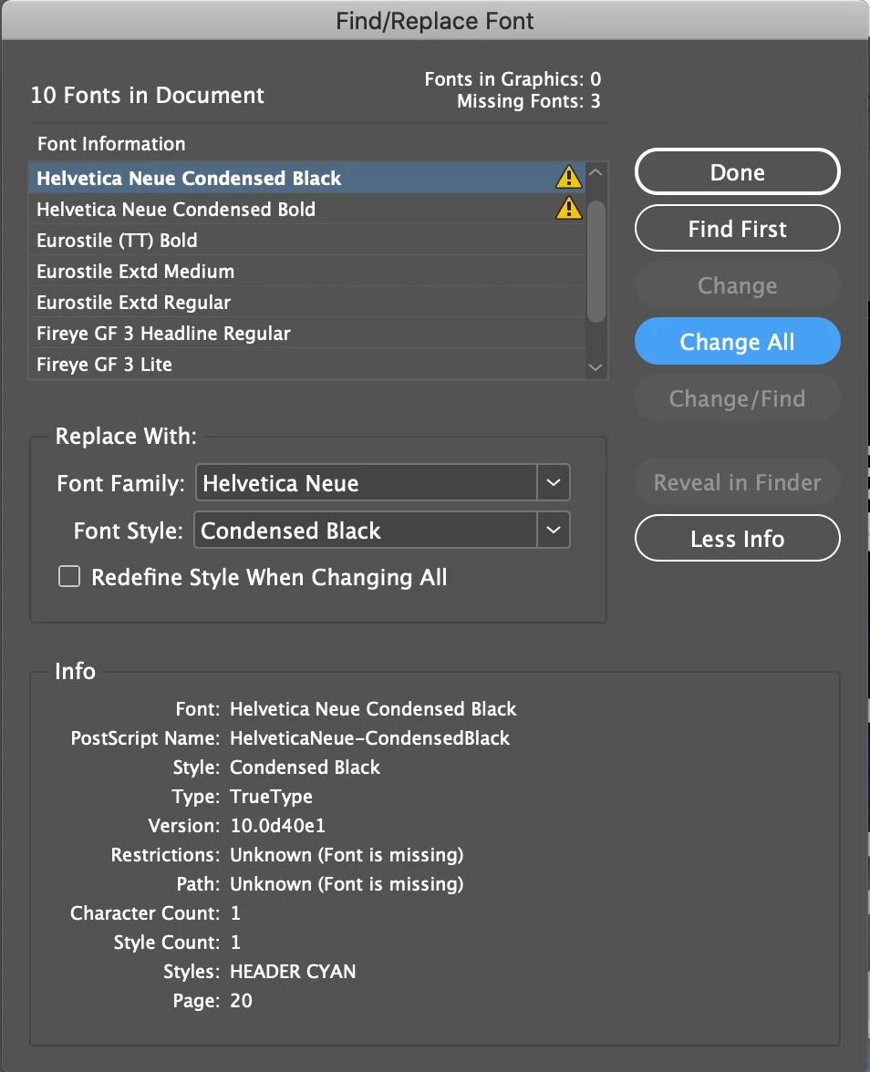Ok, the working file uses Helvetica Neue - Condensed Bold, Condensed Black, and regular. The file works fine with no errors. I package the final file. All fonts are located in the font folder in the package. Open the packaged InDesign file and "Doesn't recognize installed fonts" I try to replace the fonts with the exact same font. Sometimes they will be replaced, other times nothing happens.