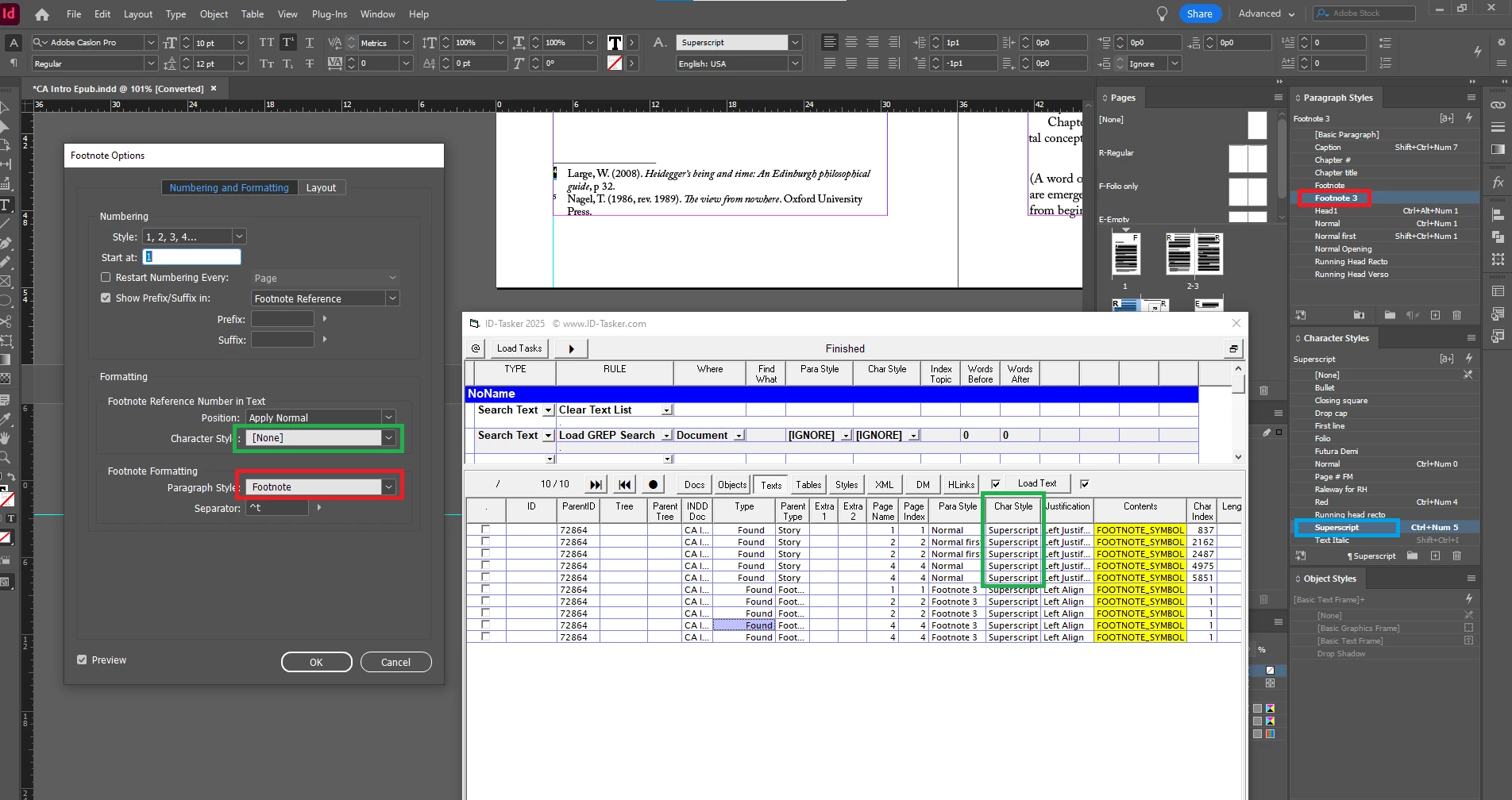 I've attached the Epub file, the InD file, and screenshots of one of the too-big footnotes plus the Character Style OpenType Features and Basic Character.