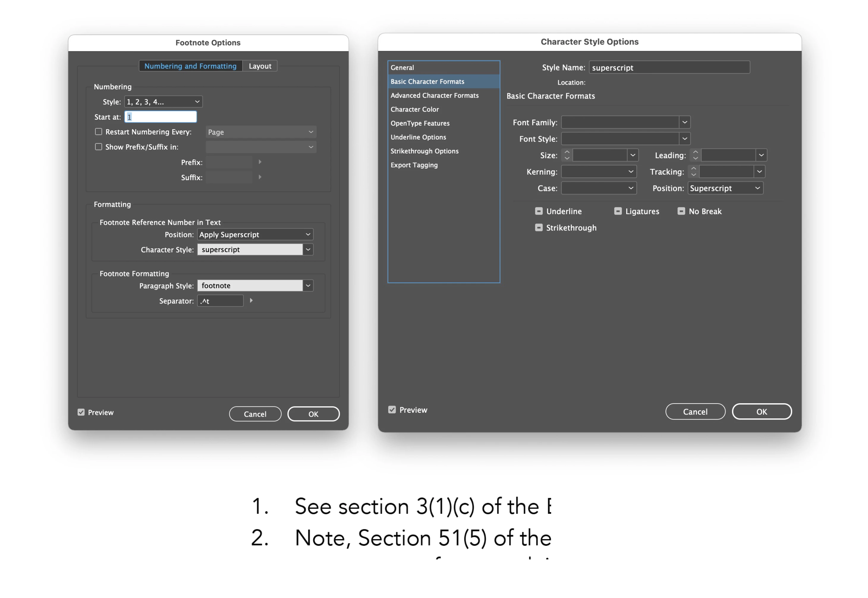 Having trouble with footnotes. I've set the footnote numbers positions to "Apply superscript" but they appeared as regular text size. I even created a character style with the Position set to superscript, and even that didn't force it to display as a superscript. Screenshots for reference. Am I doing something wrong, or is this just a weird bug?