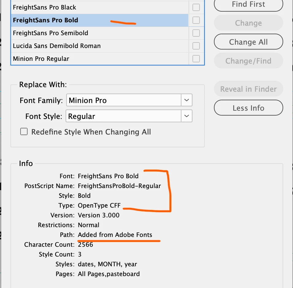 The problem came up when we sent a packaged file to a printer. They told us they couldn’t access the font because Freight Sans Pro is discontinued. On my system everything still works and displays normally, but on their end, they’re saying it’s a Type 1 font that Adobe no longer supports.