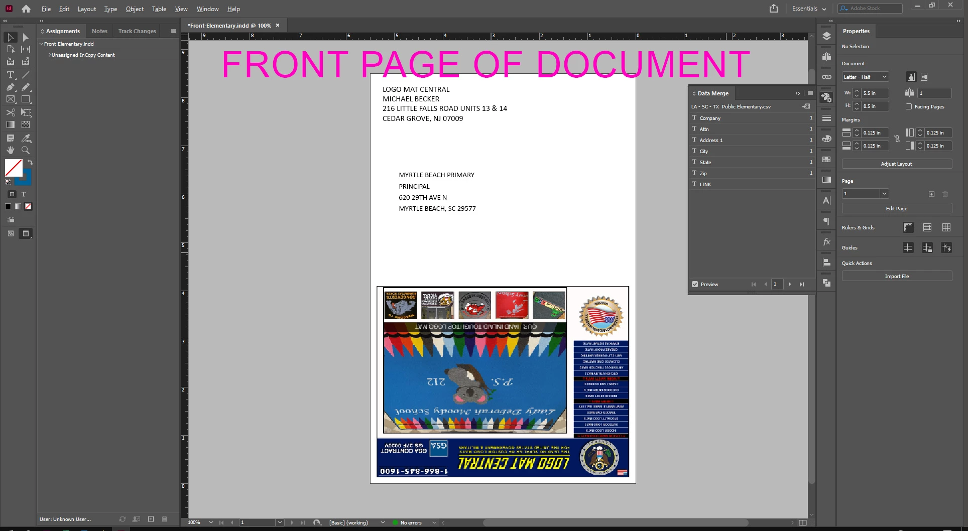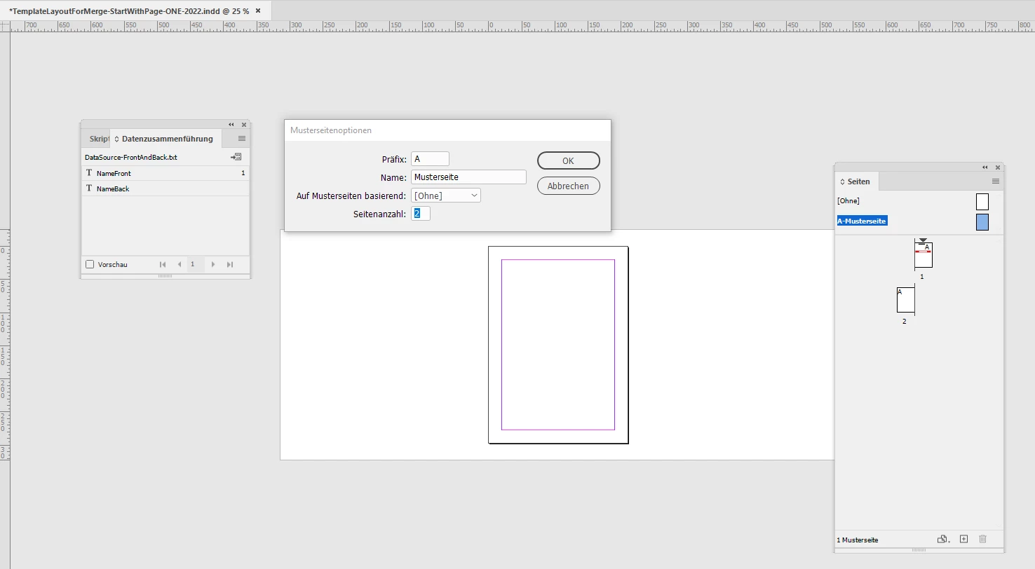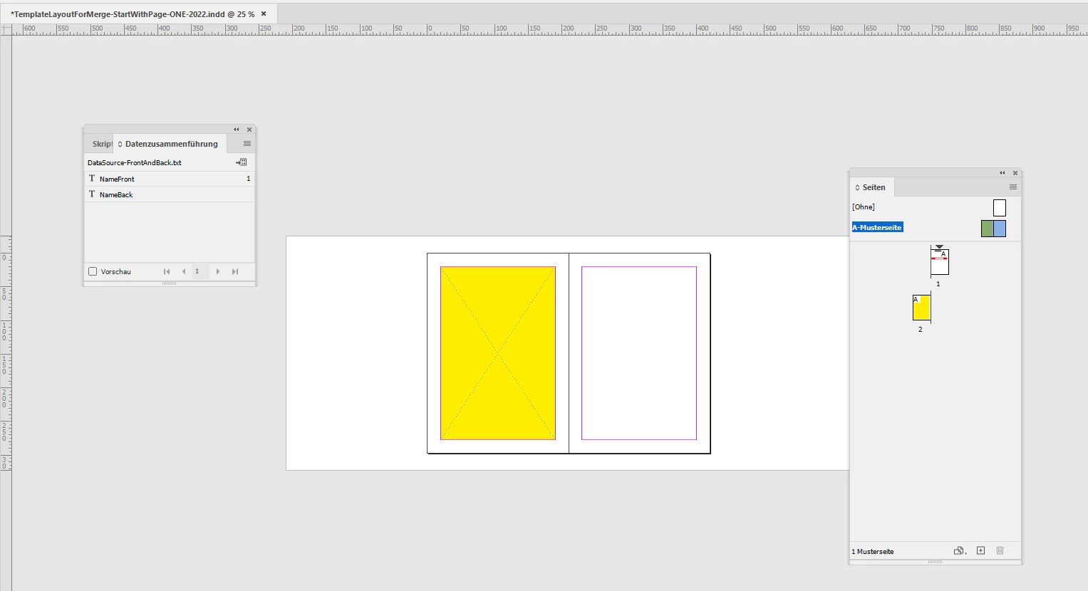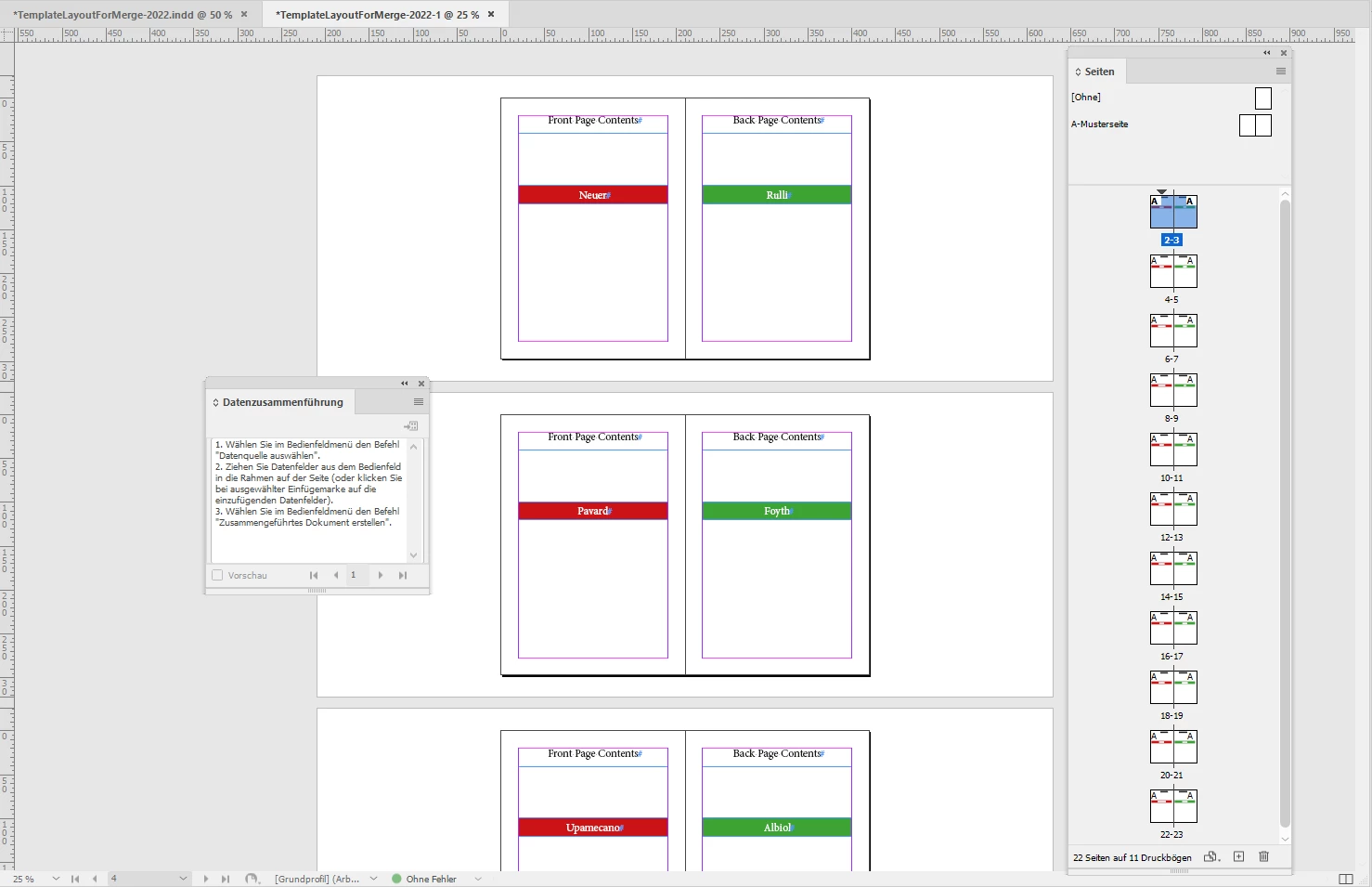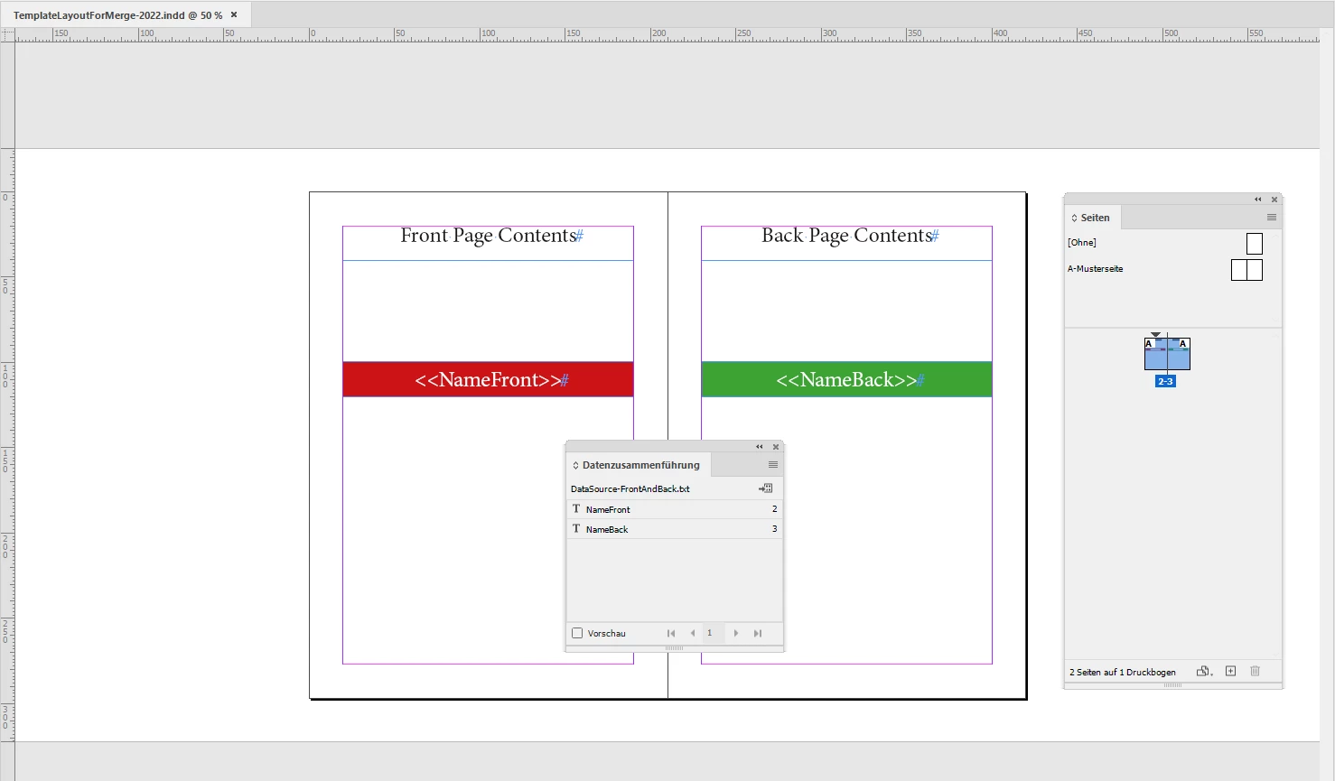 I have a 5x8 mailer printing that I create using the Data Merge feature, where all of the address data is inserted page by page on export. I attach an excel spreadsheet of address data to a file, that say is 500 addresses total, I export that Front Page of the mailer using Data Merge & that creates a 500 page PDF document. How would I set up that file with a back page file also, so that upon export InDesign will export a document that is ordered Front Page, Back Page, Front Page, Back Page & so on for all of the addresses in the attached spreadsheet. - My previous workflow was to print the front pages then manually flip the stack of paper & then print the back pages. My new printer is requesting the file as front page, back page together in a single exported file. some screenshots are attached. Thank You, I hope I explained that well & clearly.