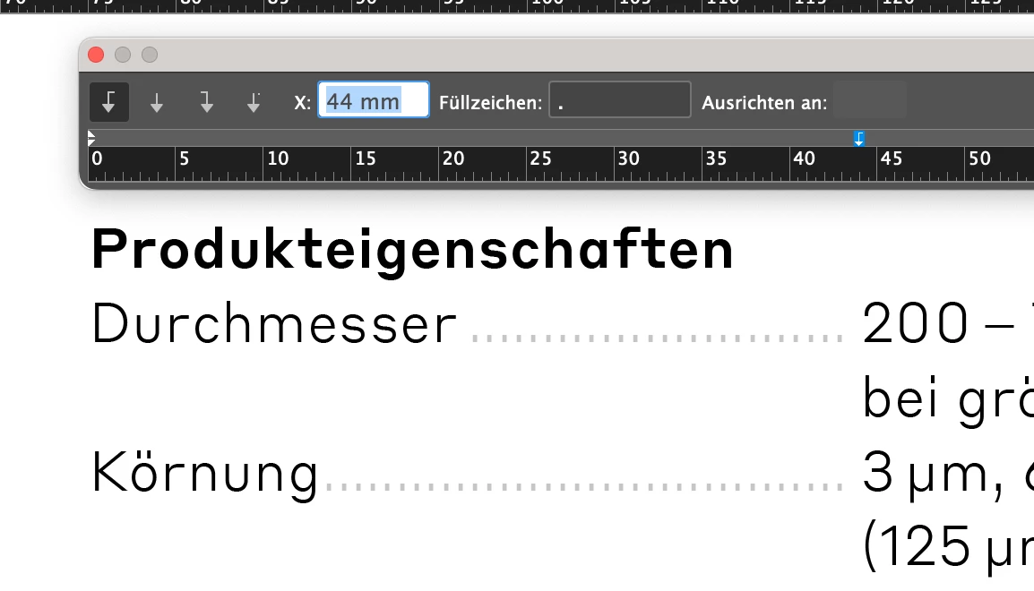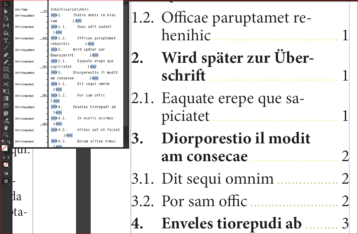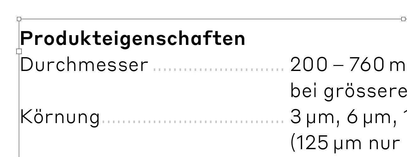 Dieser Aufbau ist mit Tabulator aufgebaut, also, die Punkte werden als Füllzeichen im Tabulator dargestellt. Nur, wenn ich es so aufbaue, kann ich die Punkte nicht separat anpassen. Ich würde diese nämlich gerne in einer anderen Farbe darstellen, damit sie etwas weniger dominant sind. Und dies alles im Absatzformat intergriert. Aktuell habe ich es mit einem separaten Zeichenformat nur für die Füllzeichen zu formatieren, gelöst. Super wäre es, wenn alles im Absatzformat intergriert ist.