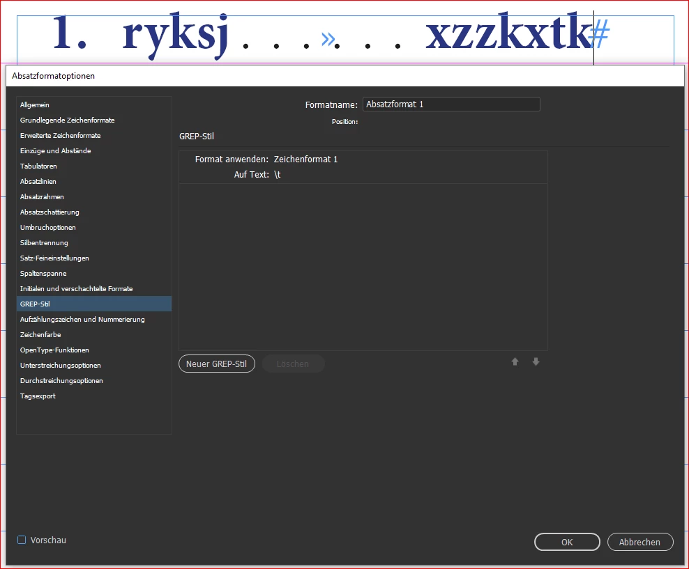 Ich bin gerade dran eine Vorlage mit Absatzformaten aufzubauen und möchte die Füllzeichen anders formatieren als den Text (andere Farbe). Aktuell habe ich das Dokument so aufgebaut: