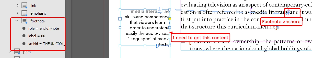 My Process: first i need to select footnote element and catch with Anchor text-frame contents.