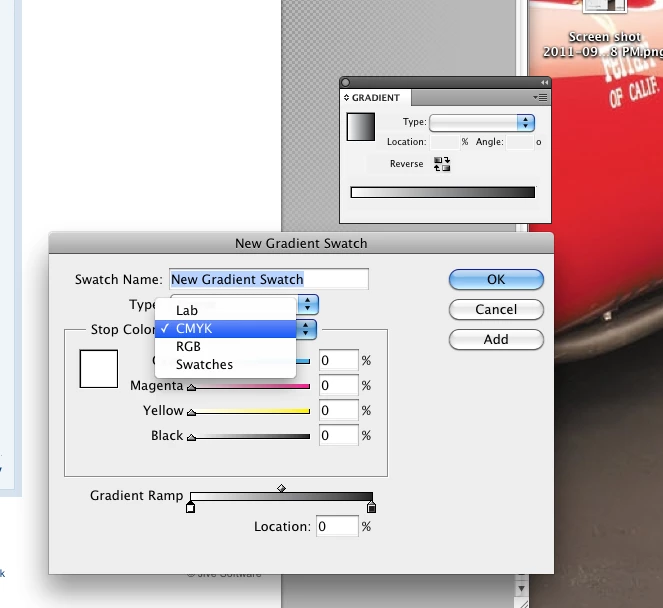 The smaller window is inaccessible. I have to close the Gradient Options window to do anything in the smaller window, and like I said, anything I do in the smaller window does not manifiest itself in any way in the document or the swatch.