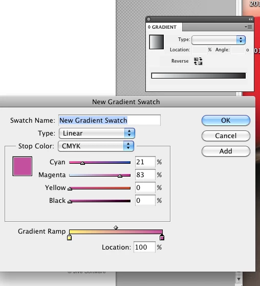There is no way for me to make the changes I make in this window show up in the document. Where is the OK button? I really, really tried. Everything. I switched the Angle. I played with the Reverse. Nothing I did reflected itself in the actual document or the swatch.
