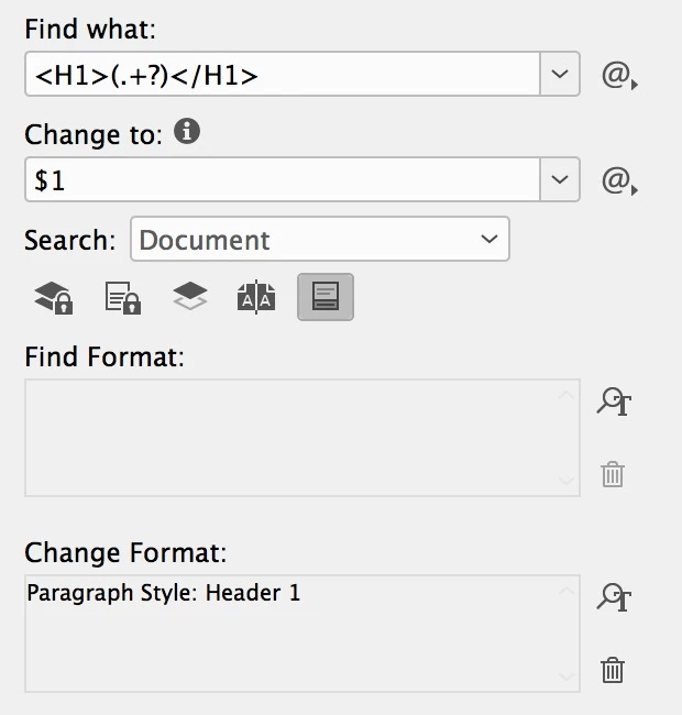 There has to be a way to do this right? It's not <H1>\w</H1> (because that's just one 1 word) and it's not <H1>.*</H1> (I'm not really use how to repeat it).