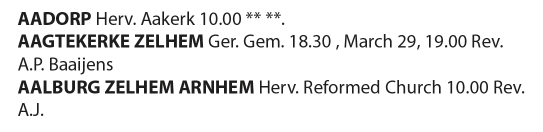 AAGTEKERKE ZELHEM Ger. Gem. 18.30 , March 29, 19.00 Rev. A.P. Baaijens