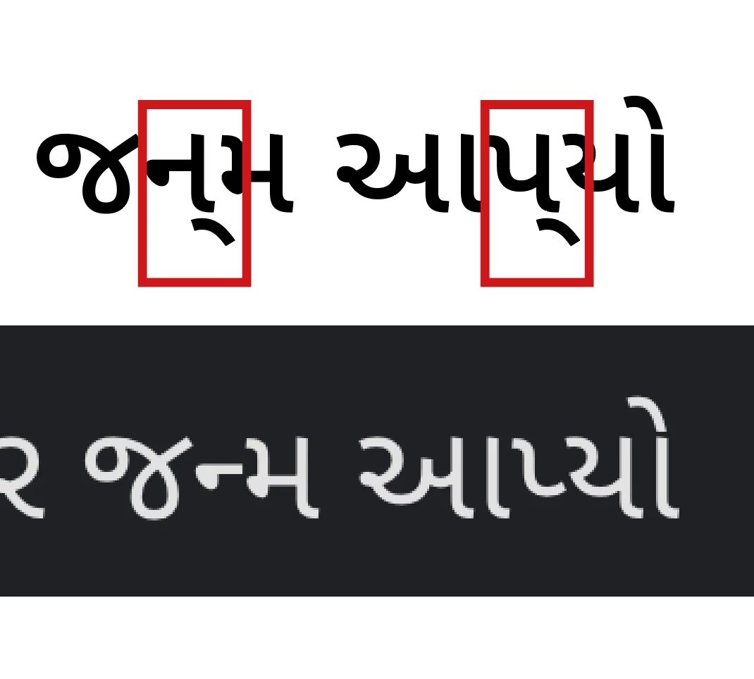 I have an InDesign document that contains Gujarati characters. The paragraph uses the Adobe World-Ready Paragraph Composer. Its language is Gujarati (India). Its font is Nirmala UI. Most of the characters are correct. However, in situations where two or three characters should be connected or superimposed, they are not.