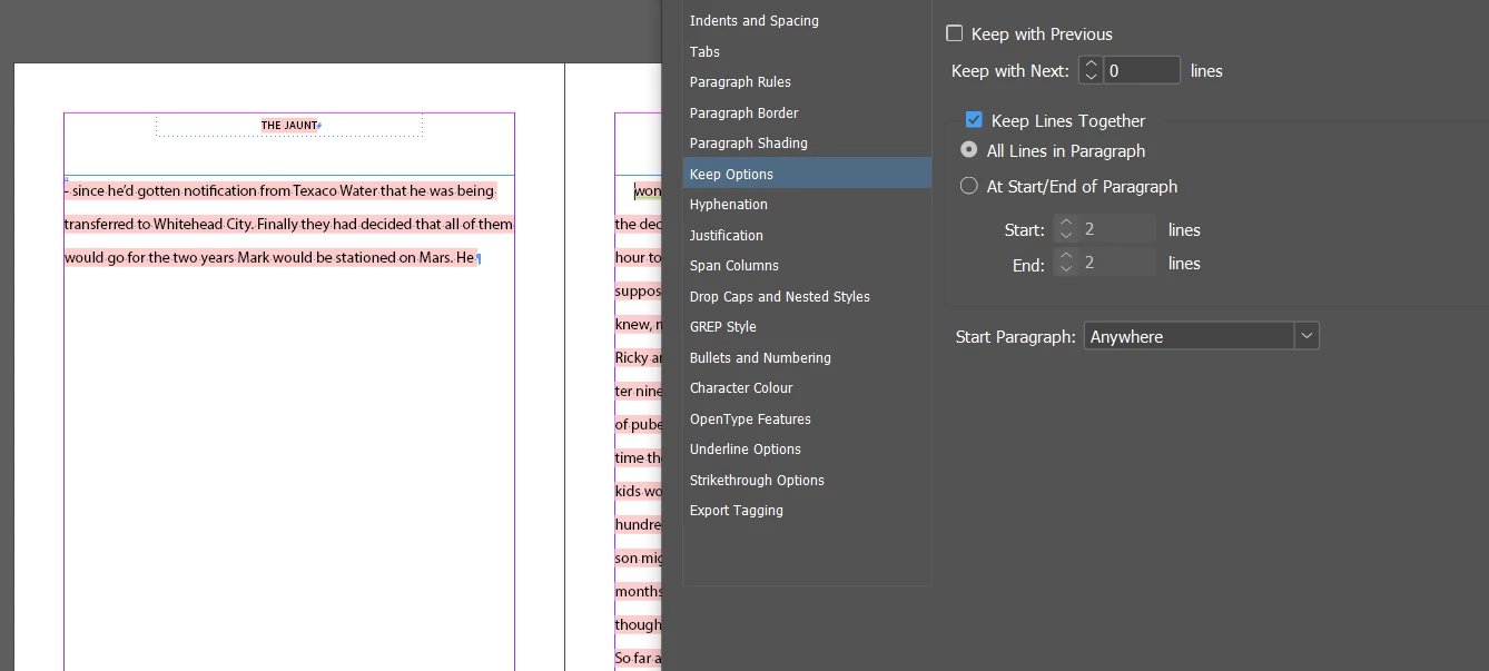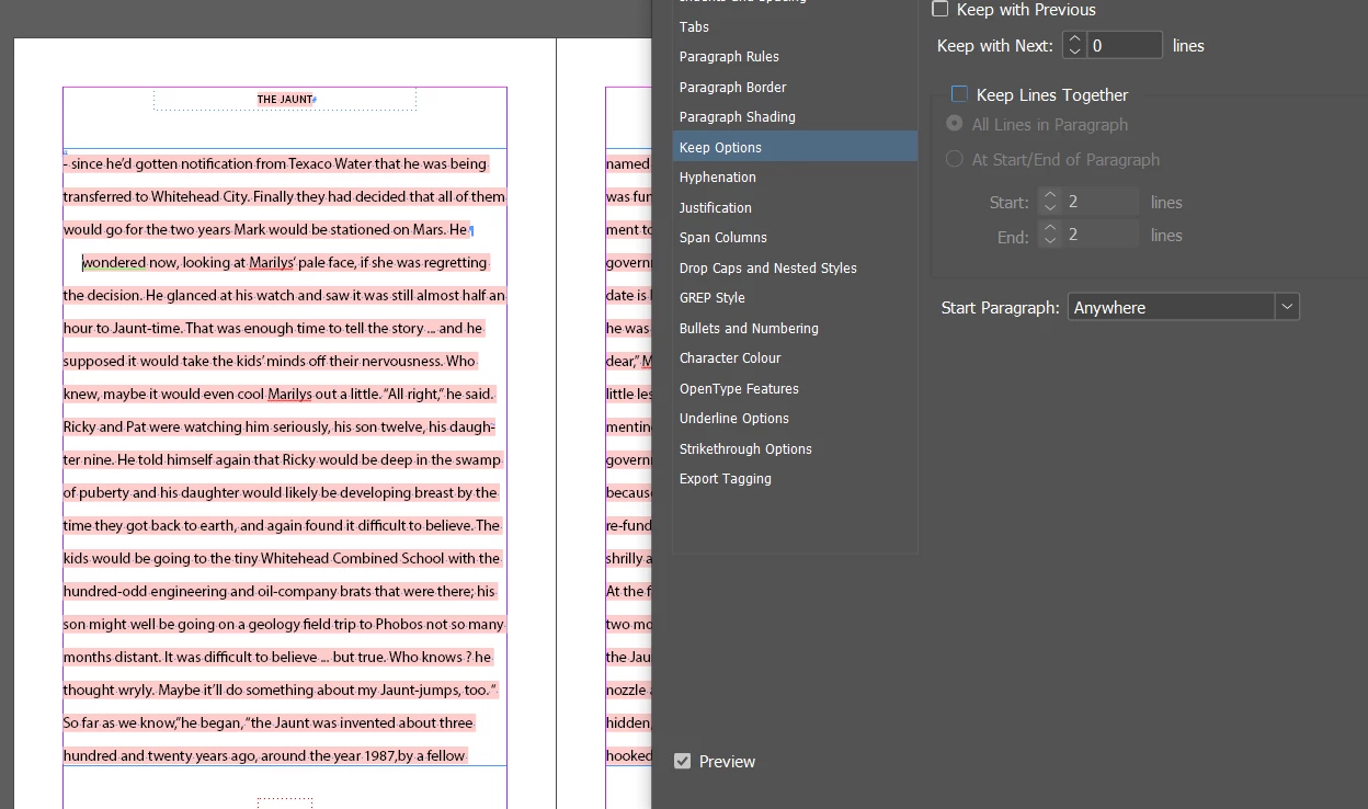 I'm currently working on a final, that being working 3-4 short stories into InDesign and printing it out to create a physical book. In my current InDesign file, I usually press enter to create a new paragraph (in this specific case to indicate when a different character is speaking), but every time I do so the text jumps to the next page? I checked in a different file that I had and the page-jumping doesn't happen. Could it be because of something I had done in my paragraph styles? I'm also including my InDesign file so someone could get more hands-on with helping.