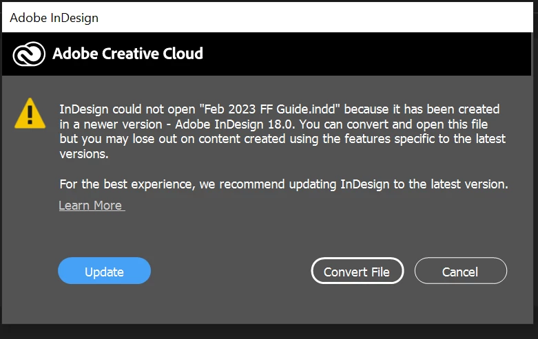 Hello, I recently updated to the latest version of InDesign. At first, I as able to open existing work files just fine, but now I continue to receive the attached message. I am working with the latest version of the program, as are my colleagues. What's the best way to resolve this issue?