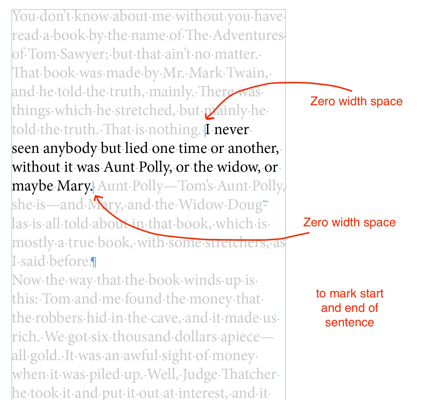 The script finds all sentences and, after duplicating the first page, drops a marker character at the start and end of the current page's sentence. The paragraph style handles the formatting—all the script needs to do is drop those markers. If the script gets the sentence positions wrong—which will happen sometimes (see caveat in script)— you can just move them manually by cutting and pasting the zero width spaces (show invisibles to see them). See screenshot.