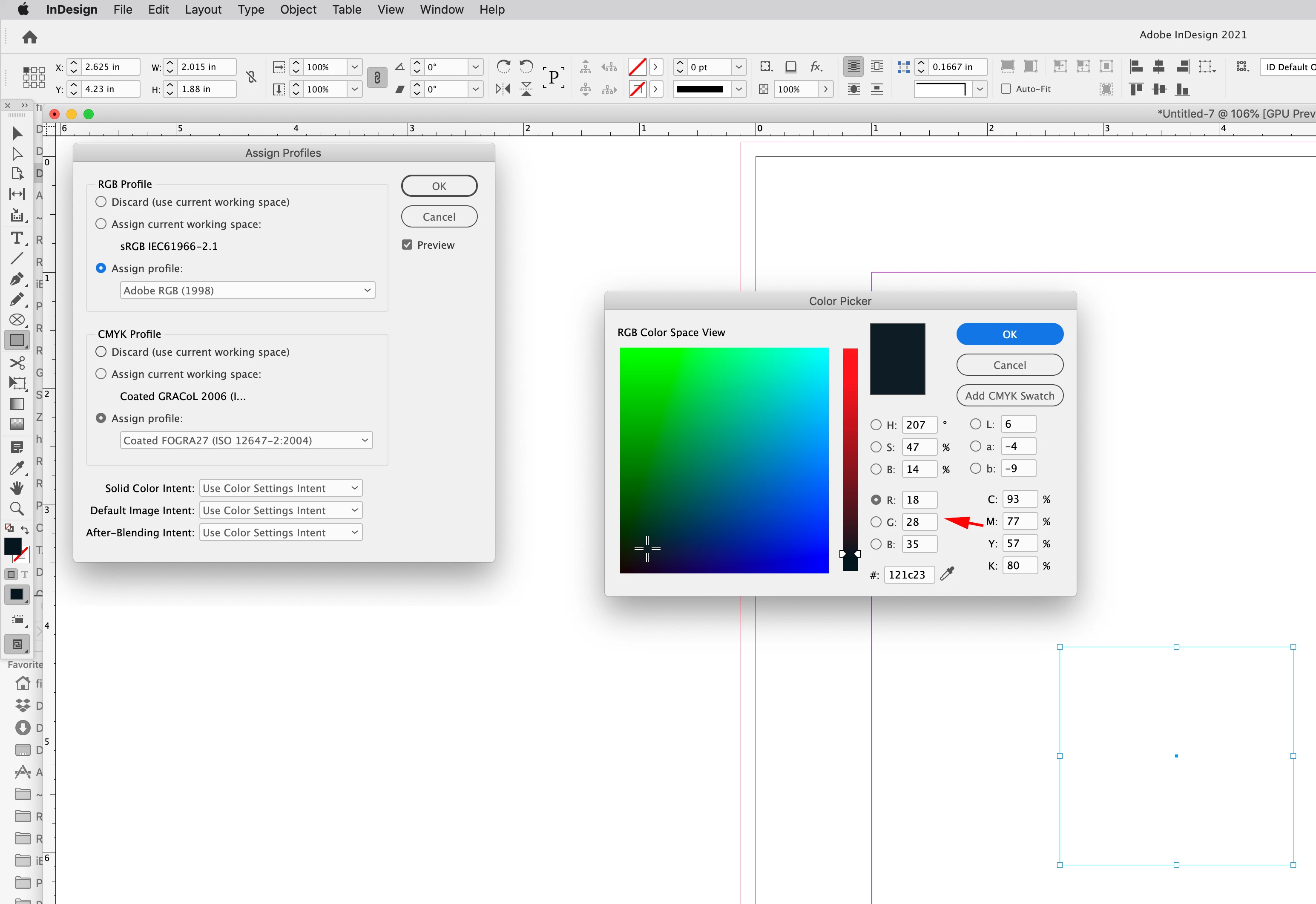 Keep in mind that CMYK to RGB/Hex, or RGB/Hex to CMYK conversions result in different values depending on the document’s assigned profiles Edit>Assign Profiles... If I enter a specific CMYK build in the Color Picker’s CMYK fields, the RGB/Hex values are going to depend on the assigned profiles and the Color Settings Intent setting. Here you can see the difference in the conversion from Coated FOGRA27 to AdobeRGB vs. US Web Coated to AdobeRGB.