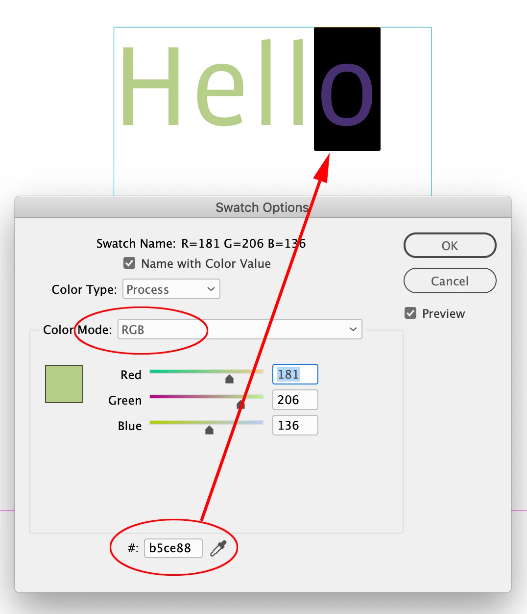 I have a color picked in a different app which is Hex code #B5CE88, however in Indesign it keeps changing to a different Hex code; #B6CE89. Since it's not much of a difference, I used this in my design for a rectangle in the design. However, when I want to use that same Hex code in text it changes to a third color/ hex code, being #b3cc88. Eventually I want my design to be printed so I checked the CMYK % as well, #b3cc88 is 41, 0, 58, 0 (CMYK) and #B6CE89 is 40, 0, 58, 0 (CMYK). When I fill in 40, 0, 58, 0 at CMYK in the color picker it changes to another color with a new hex color (b4cd89)
