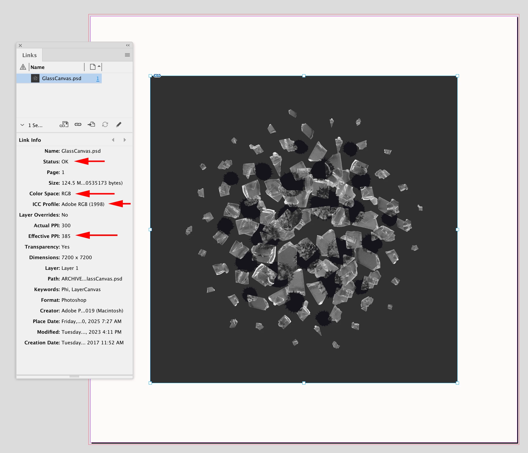 When placing the main large-format photograph, what is the best practice for its color mode and resolution to ensure high-quality printing, and which InDesign panel would you use to verify its link status and color mode?