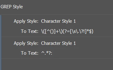 I want to apply character style named RED using GREP Styles/Nested Styles but only till the first : from the start and the last parenthesis. What grep should I use ?
