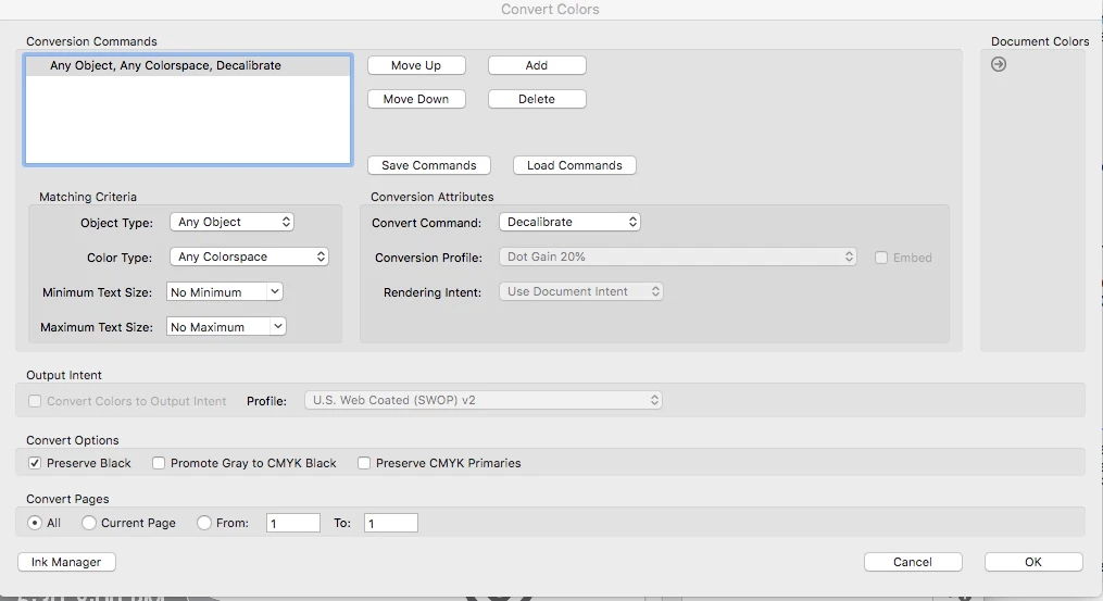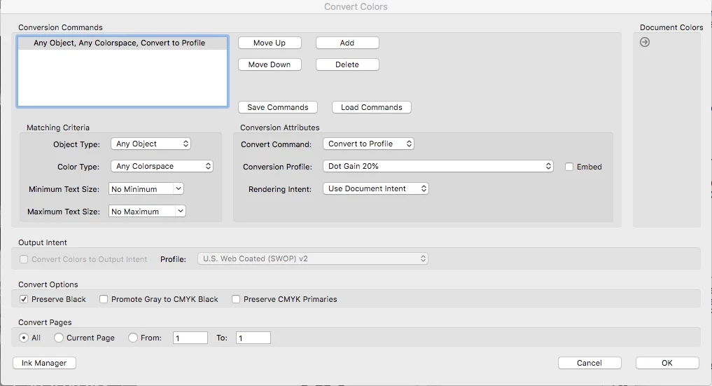When I find a pdf that has C,M,Y and/or RGB values I've been converting it in Adobe Acrobat using Print Production -> Convert Colors and selecting one of the Dot Gain conversion profiles. My questions for this are: