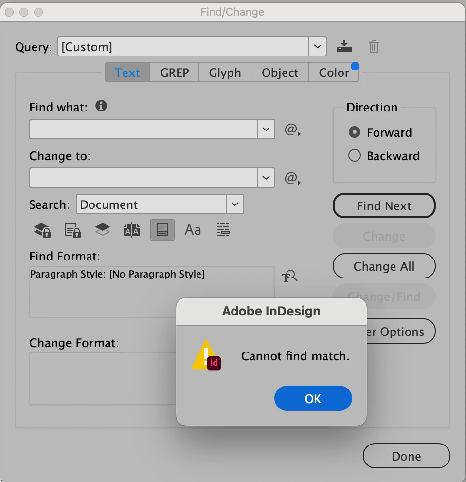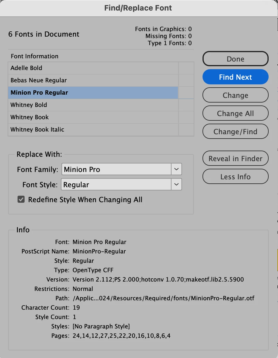I am trying to locate instances on Minion Pro Regular. According to the Find/Replace Font dialog box, it is used on 12 different pages, in a total of 19 characters. But when I click on "Find Next", nothing happens.