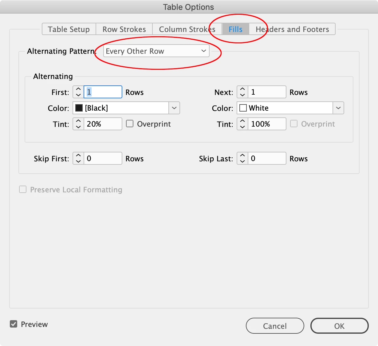 Then choose Table>Table Options>Fills>Alternating Pattern>Every Other Row, and set your alternating colors: