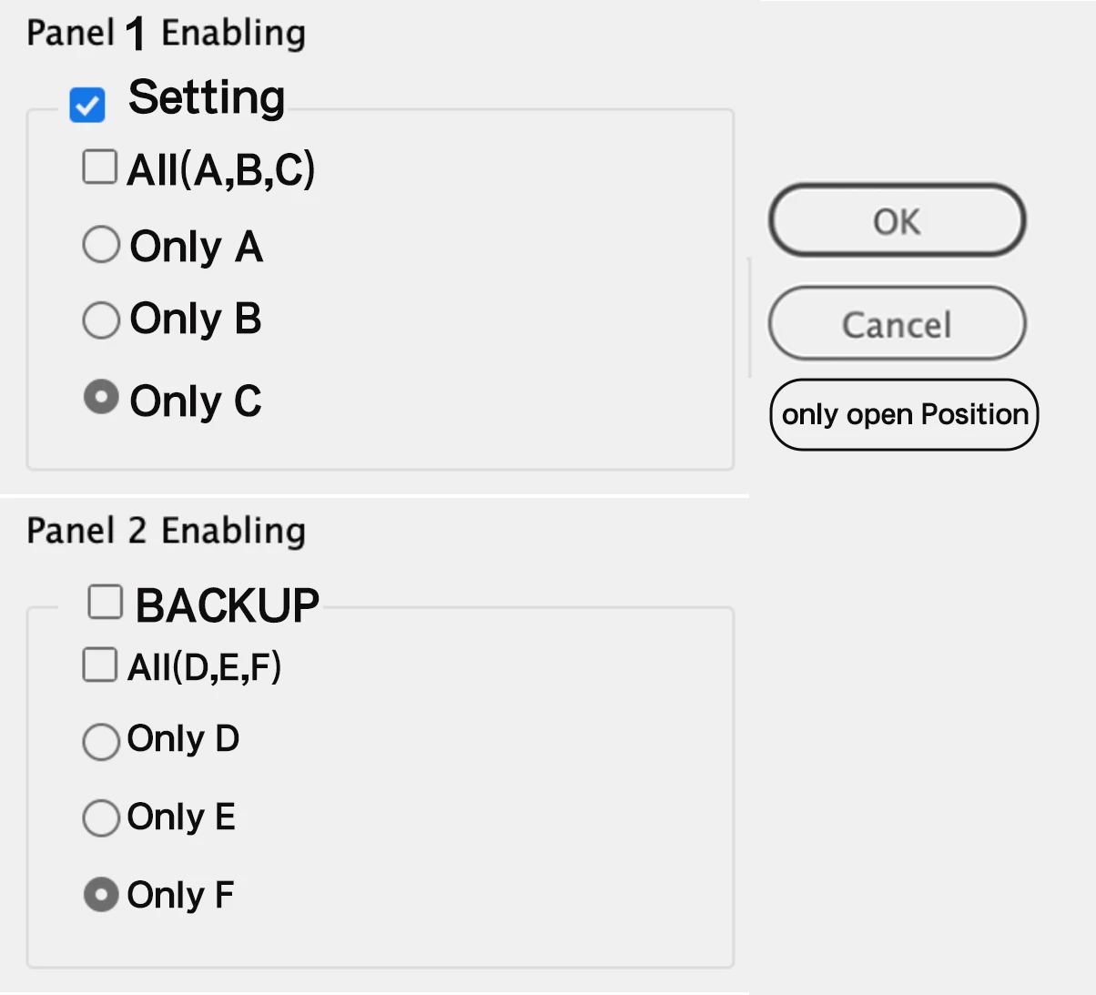 When I select “Setting,” it executes the function below it. If “All (A, B, C)” is checked, it sequentially executes the three functions A, B, and C. Otherwise, it executes only one function.