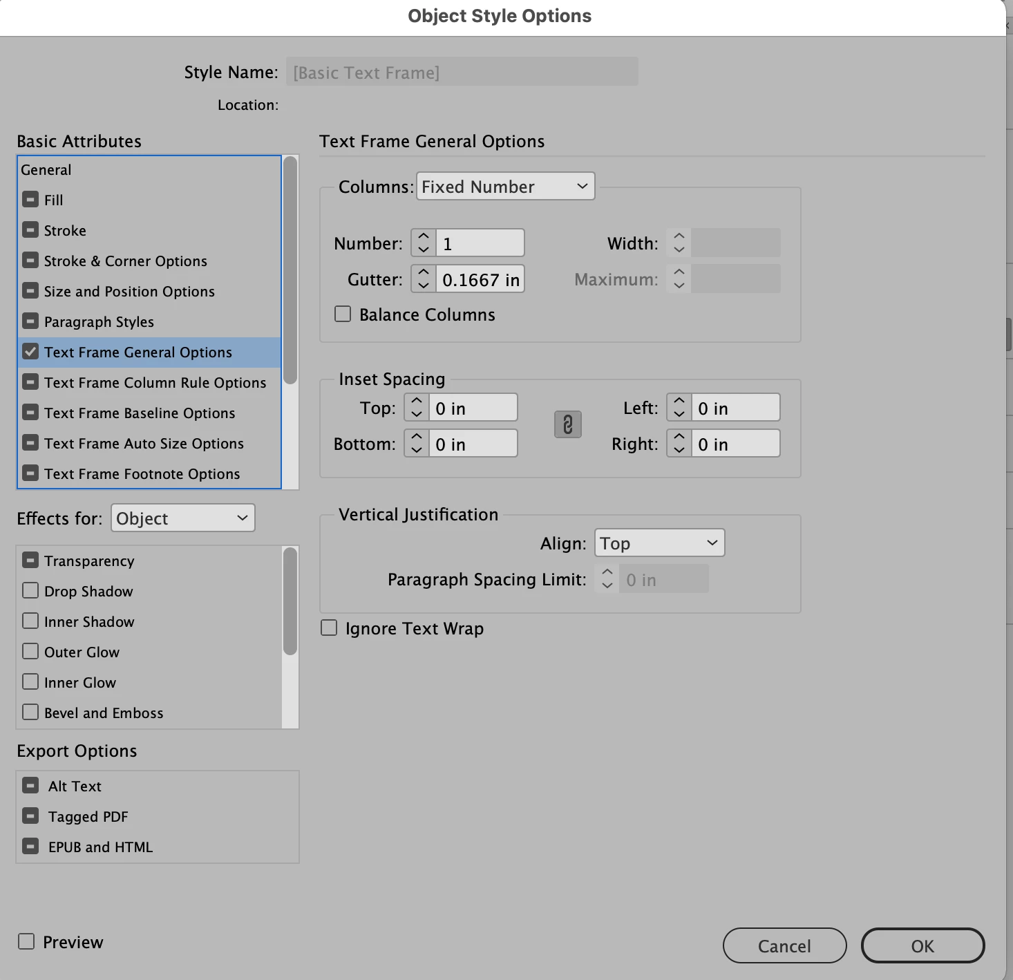 Along with another problem recently solved, I'm having an issue creating a new text frame that I never had before. Any new frame that I create always seems to have vertical justification set to center. While it's easy enough to fix on a frame-by-frame basis I'd like to reset to default to Top, which it has been for a long time.