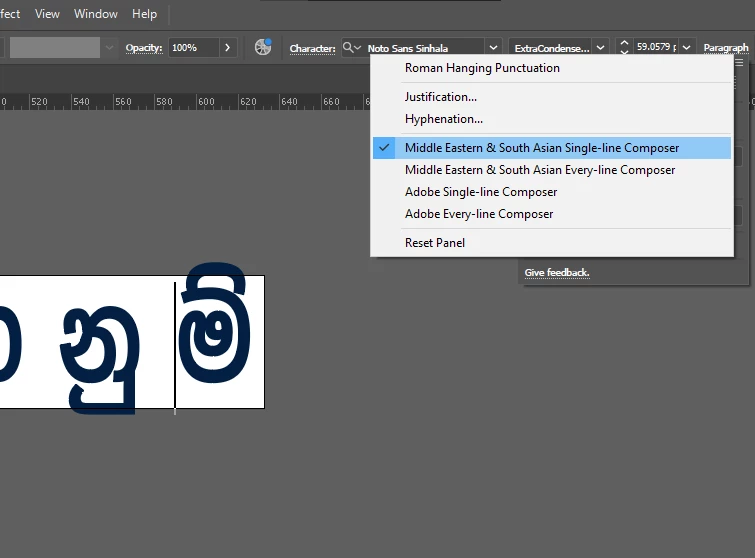 4. Create text and Gotp Paragraphe -> Click option bread icon(top right conner of the pan) -> Select "Middle Eastern & South Asian Single-line Composer"