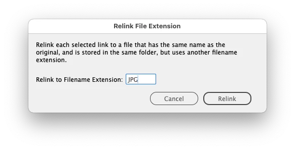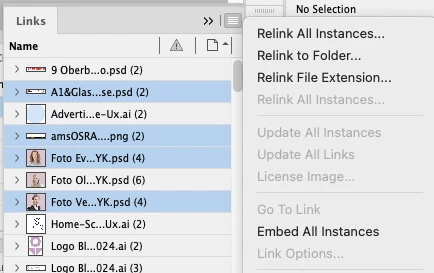 What I would suggest is, that you select all the links of which you know, they should get the same file extension – use the CTRL (Win) / CMD (Mac) key to select non-consecutive links, the SHIFT-key for consecutive selections. Then go to the links menu in the top right corner and choose “Relink File Extension…”