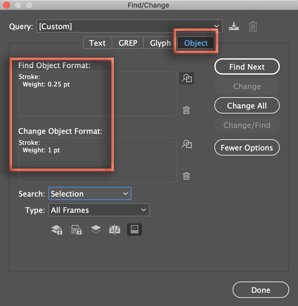 Is there a way to find and replace all the strokes comprised between different thicknesses, for example between 0.01 pt and 0.09 pt with strokes of 0.1 pt thickness?