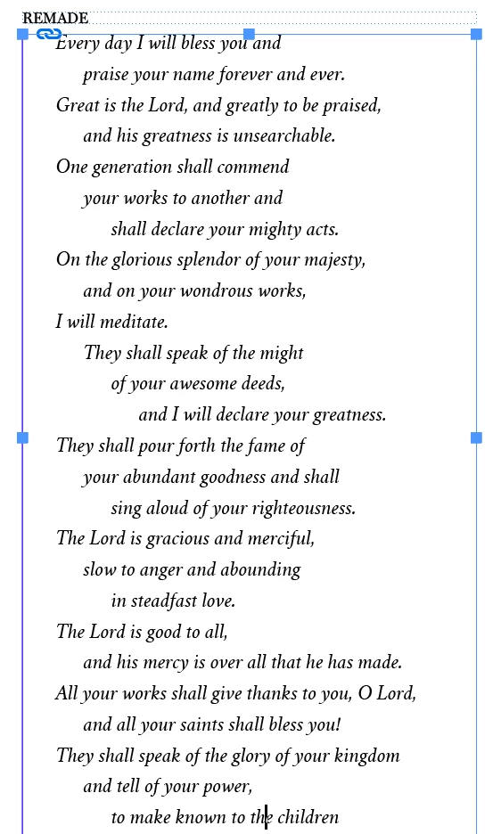 I am putting a Psalm in regular document format for a book. The Psalm was copied online. It will have a typical format for poetry with every second line indented. Some stanzas have a third and some have a fourth. These just continue to be indented in stair step. I was trying to select a section and apply the paragraph style. This is what did not work. I see now if I just click on each line it works. It retained it's original formatting, every line is a new paragraph. This made it easy to do. I'm including a screen shot in case anyone wants to see what I am talking about. Thanks for answering, Steve.