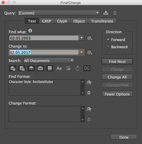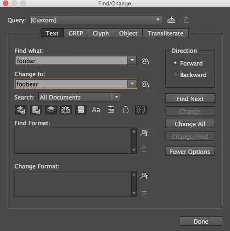 However, when I have a single edit to make to 100 footers, I don't script it. (Partially because I write scripts at a glacially slow pace.) I generally use the Find/Change dialog. When I handle files like this, the footers tend to be in master pages, but this will change 'em even if they're on the live page.