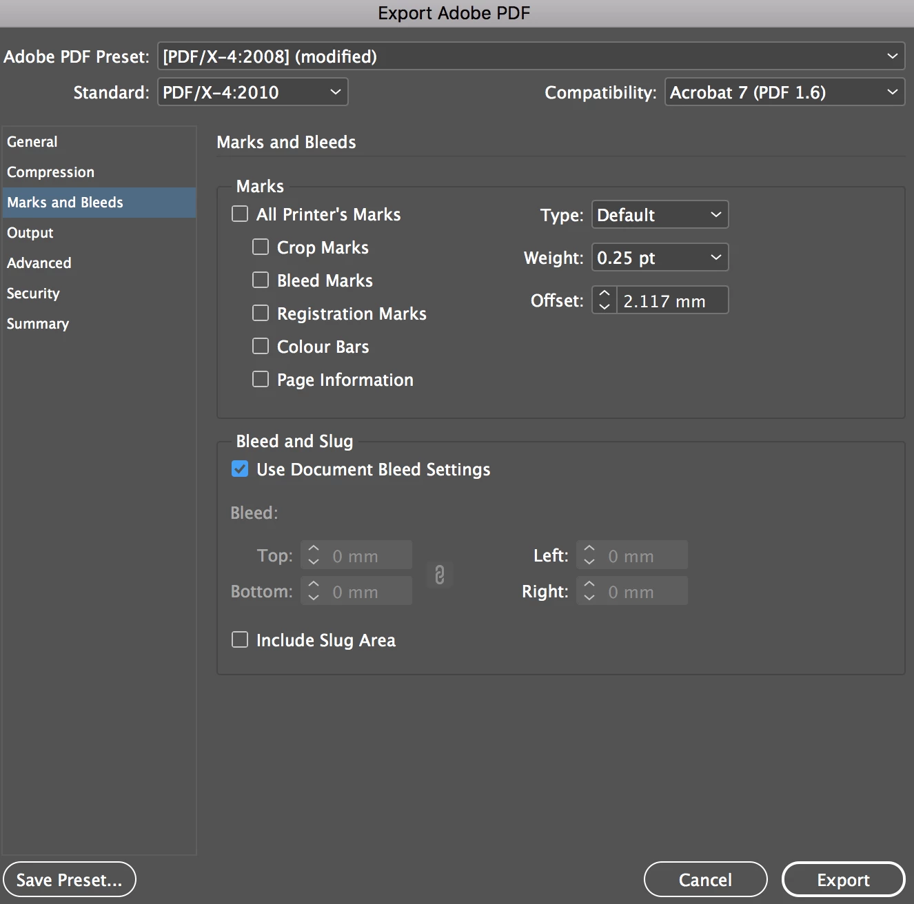 For some reason i only have two options in Indesign subscription service, pdf with bleeds cut off and bleeds with marks and surrounding white space.
