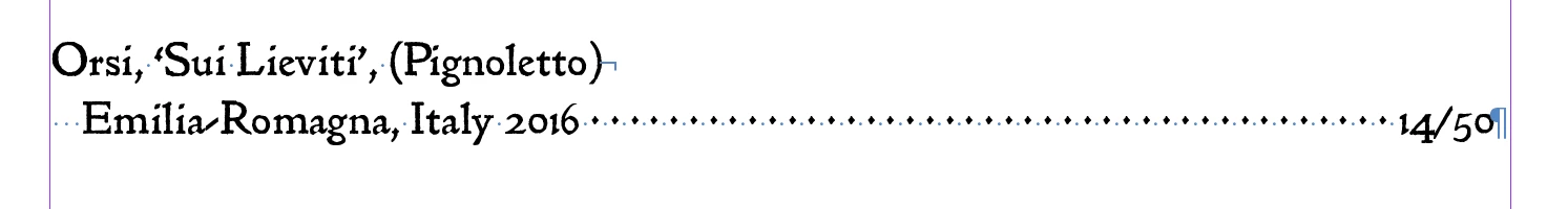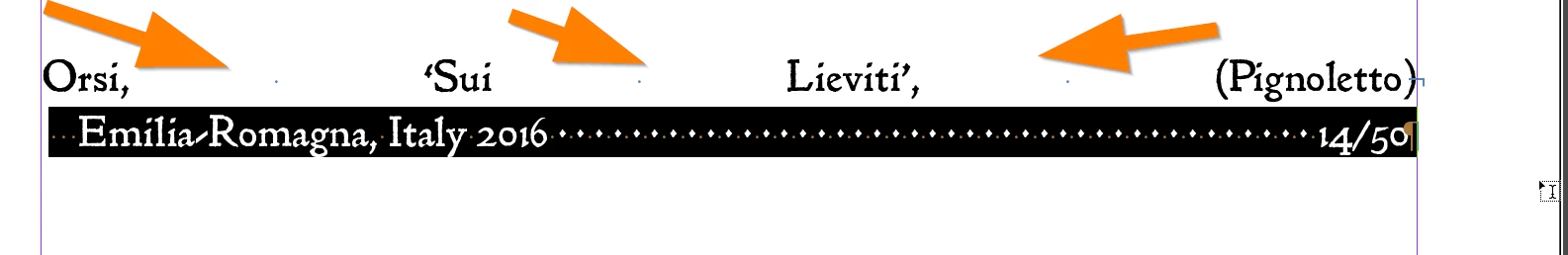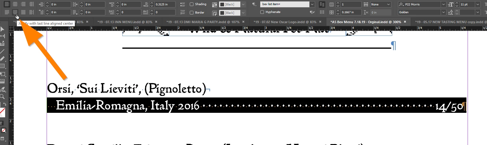 Hi, I'm working on a wine list. Here is the basic paragraph style that I have on each item. "Normal + next: [Same Style] + P22 Morris + leading: 14pt" with all text set to align left. Here are some screenshots of my problem.