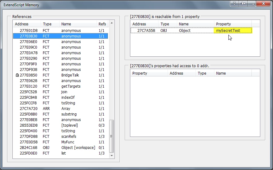 According to your own screenshot, mySecretTest is a property that refers to an anonymous function which you can access from an object located at [27C7A558] in your ExtendScript memory. I guess that this object is $.global.indesign. It contains a lot of preloaded properties and methods. $.global.indesign.mySecretTest.toSource() reveals that this is an empty function (no effect).