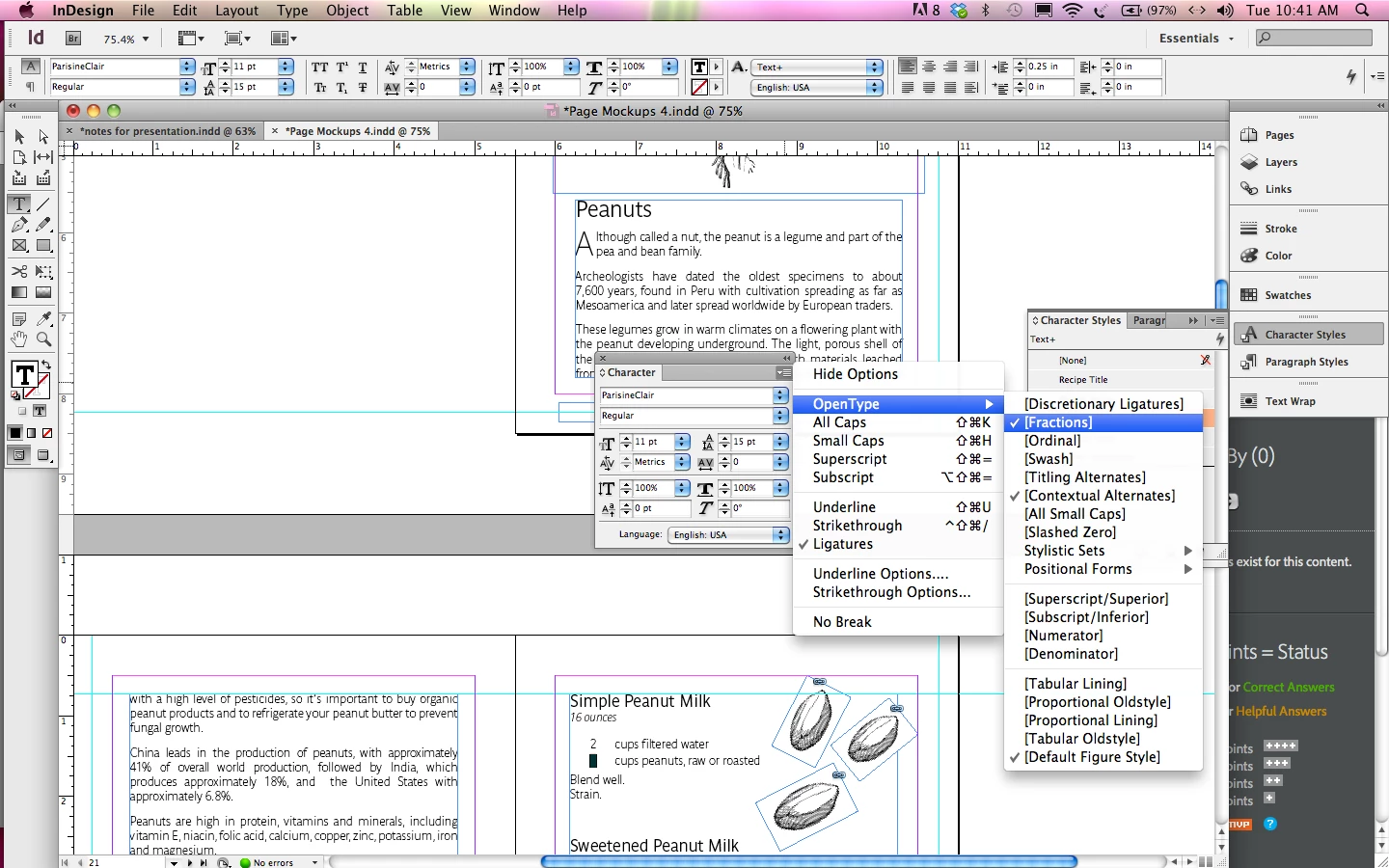Steve, Your suggestion  seems like a good solution but not all of the fractions appear (1/3, 2/3) and I'm using an open type font. Also, I notice that some of the options in the charachter panel are in brackets. What does that mean? See attached screen shot below.