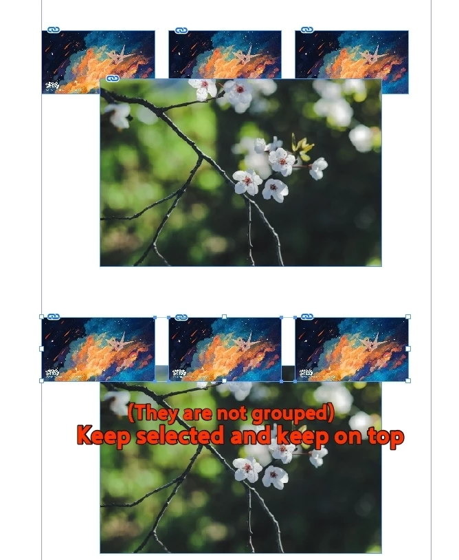 Suppose I’ve selected three objects. In the end, I want those three objects to remain selected and be moved to the top of the stack relative to all other objects.