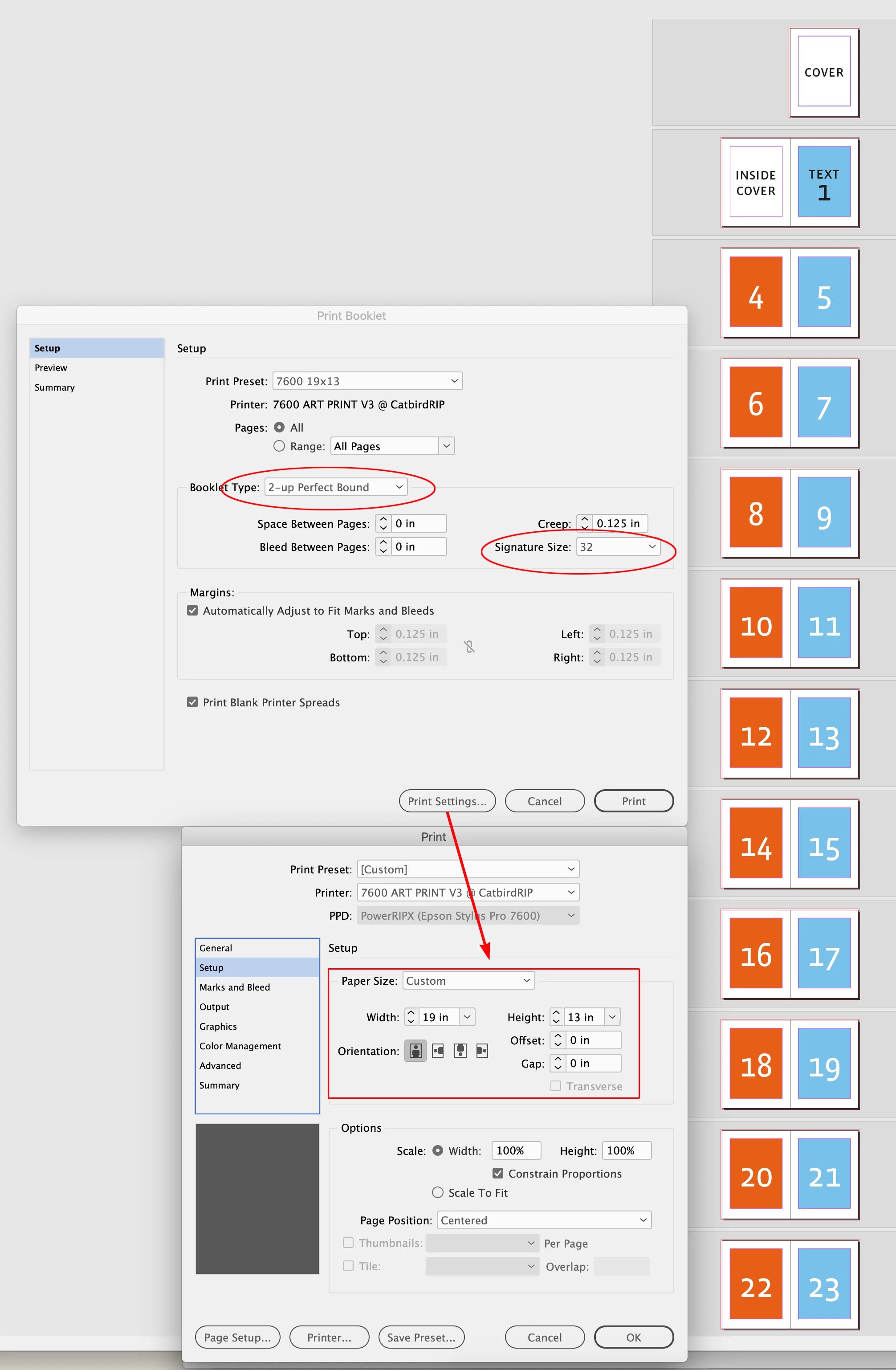 How do I print a 448 page book, 2 pages per side of a sheet of paper, in 14 signatures of 32 pages?