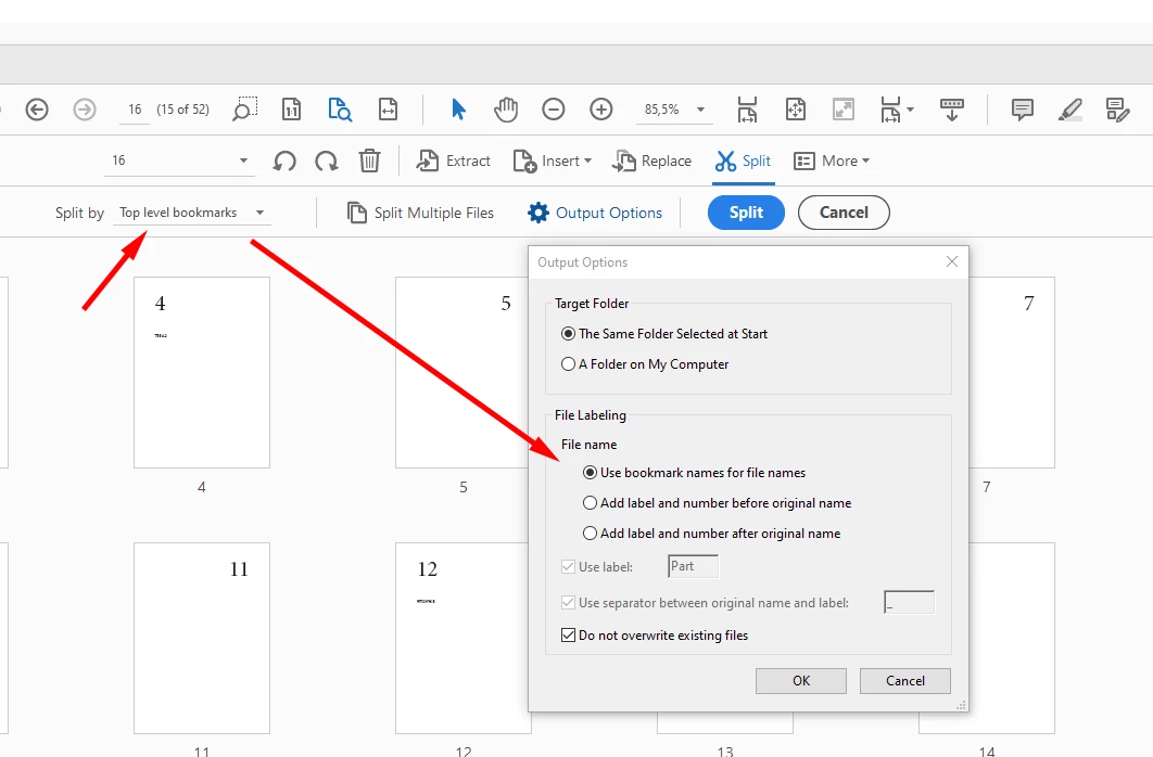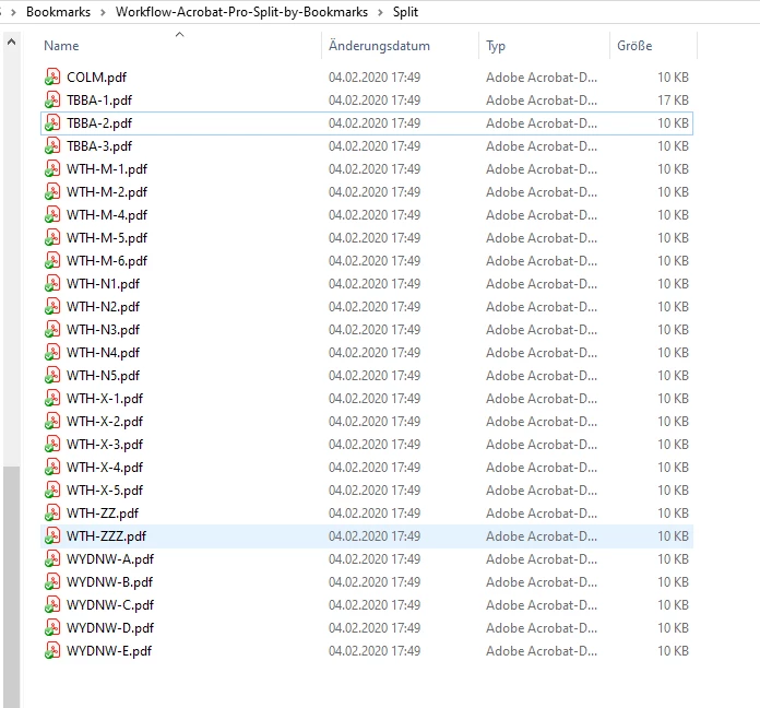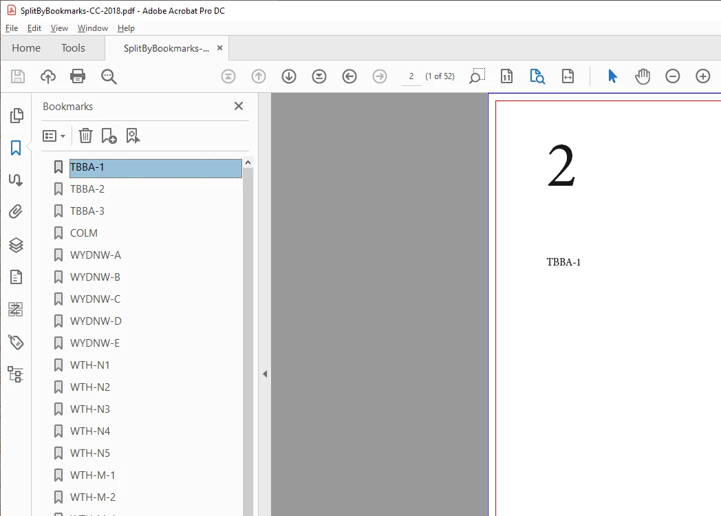 EDITED: Changed and added screenshots and text to make the point more clear, that the top level bookmarks are the separators for splitting PDFs in Acrobat Pro.