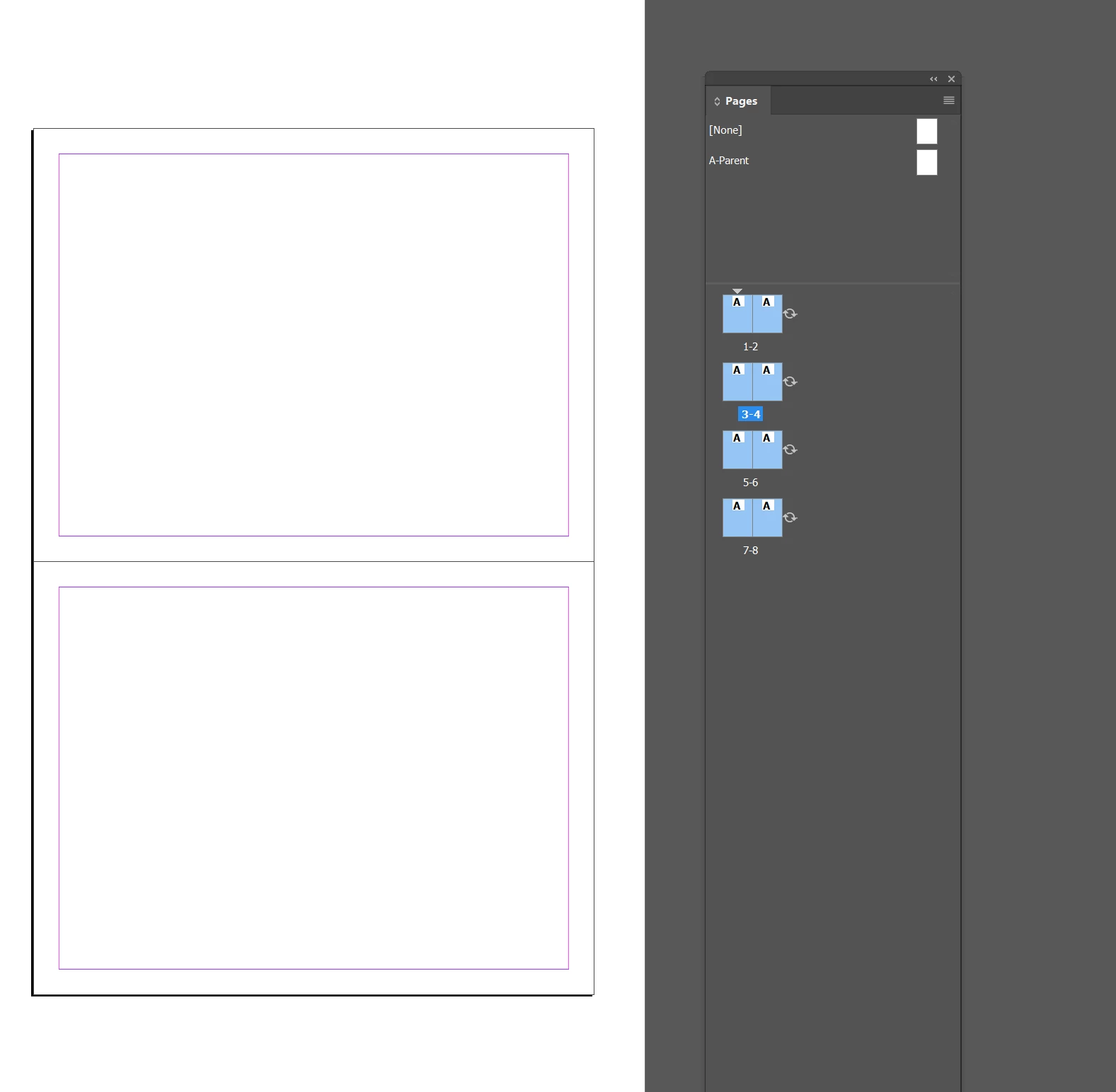 We edit an Indesign file with many pages in A4 vertical format. Each page can be divided in 2 (up part R1 and down part V1 for page 1 and so on for page 2, 3, 4,...)