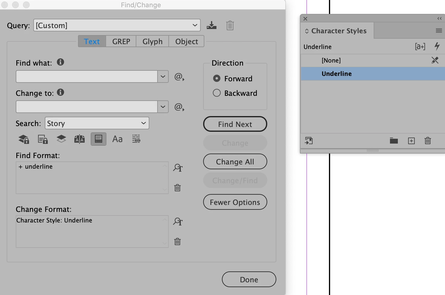 Use the buttons at the bottom of the Find/Change dialog box to find formatting and change formatting: